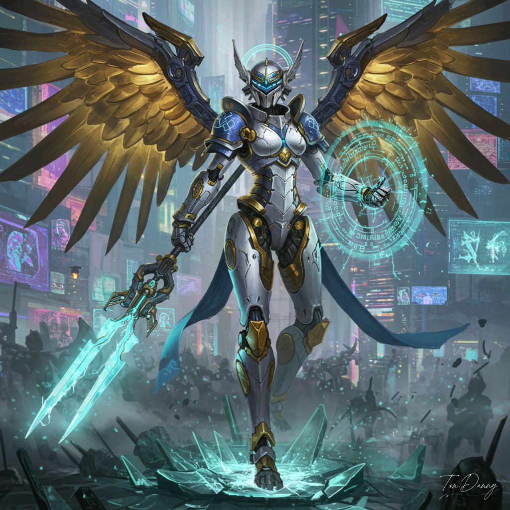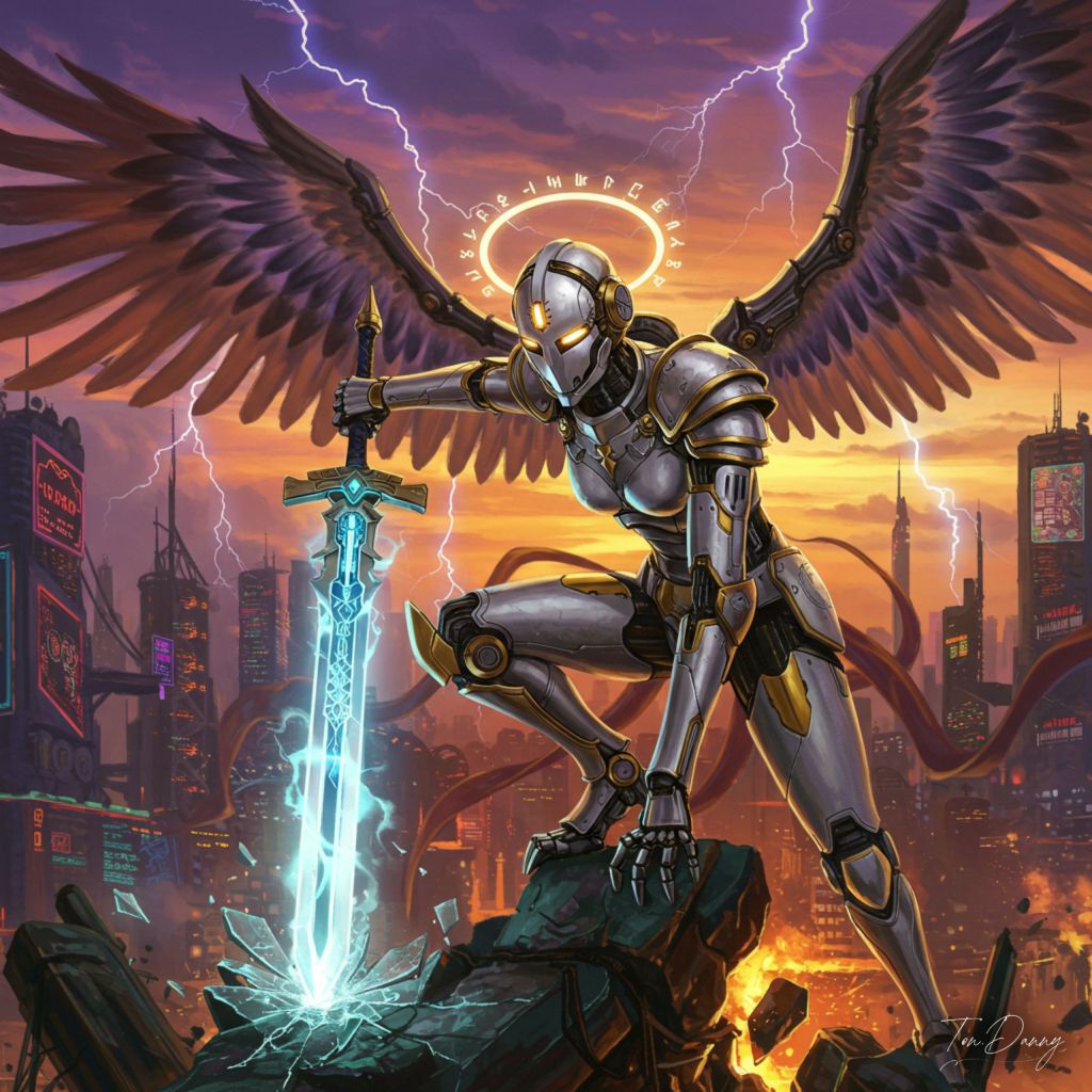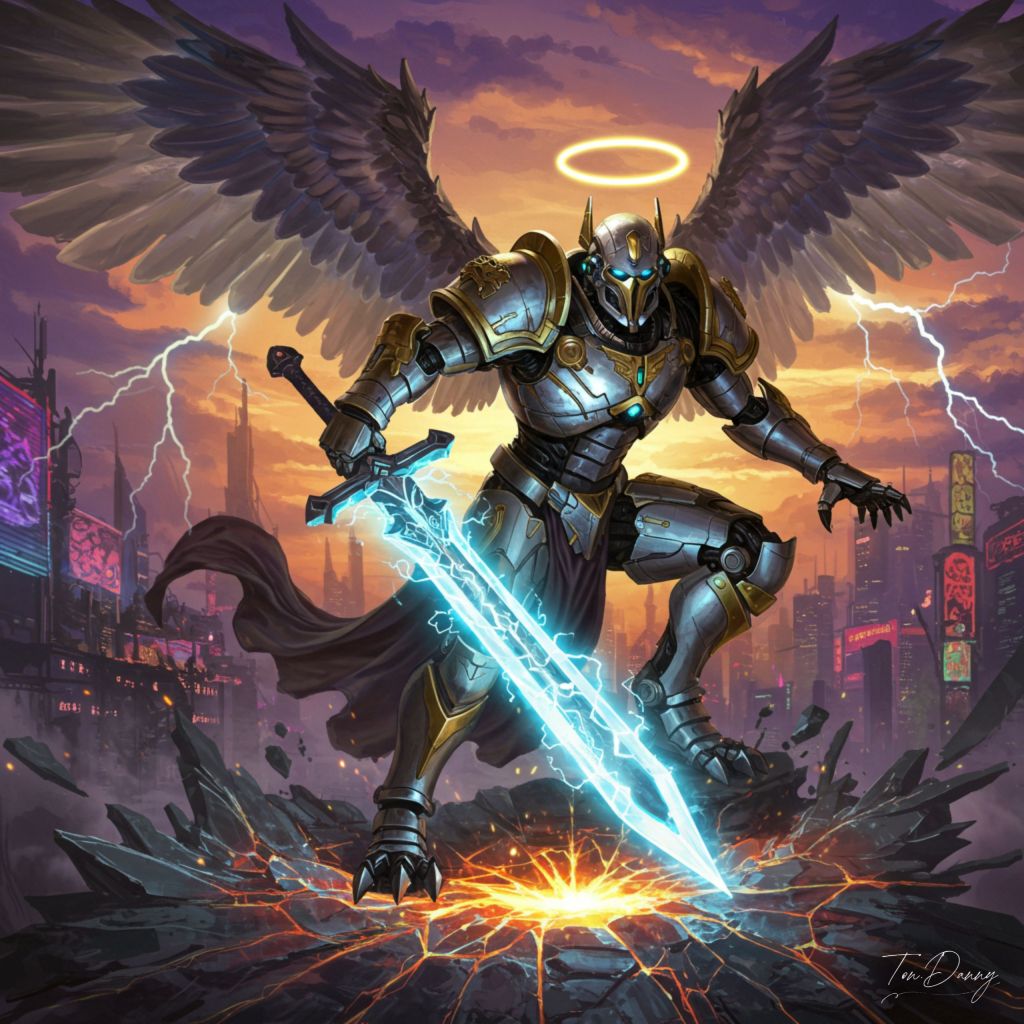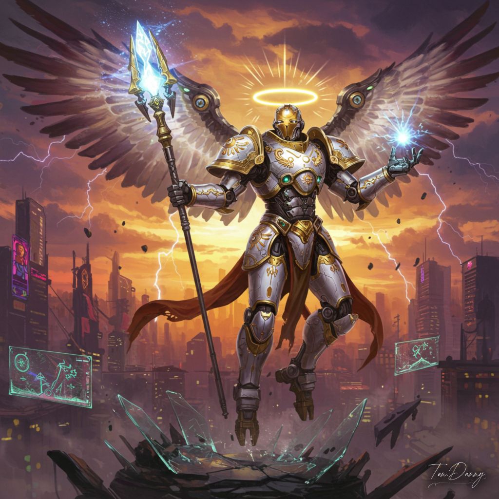 Oil Painting Archangel-shaped Robot Cyberpunk Style The robot hovers in a dramatic pose above a shattered glass monument, one massive mechanical wing extended outward in a protective arc, while the other tilts upward with glowing propellers and energy cores emitting a radiant blue-white aura. Its angular halo blazes intensely, casting a divine light that pierces the swirling energy mist. The robot’s body, clad in reinforced White and Gold armor etched with glowing celestial glyphs, leans slightly forward as if ready to strike, emphasizing its immense power and control. Its left arm wields an oversized Cyberpunk Style Energy Staff, raised high and radiating plasma energy like a miniature sun, while its right hand is extended downward, glowing circuits forming an intricate sigil in midair. The robot’s mechanical mask resembles a knight’s visor, with glowing golden optics scanning the battlefield with precision and authority. Thick, armored legs with hydraulic stabilizers are slightly bent, as if preparing for a controlled descent, while glowing panels hum with energy. The background reveals a sprawling Cyberpunk cityscape, with towering neon-lit skyscrapers and swirling purple-orange clouds split by jagged streaks of lightning. Holographic symbols and projections reflect off the mist, framing the robot in a luminous, divine halo of light and debris, emphasizing its role as a celestial enforcer descending upon the chaos below.
