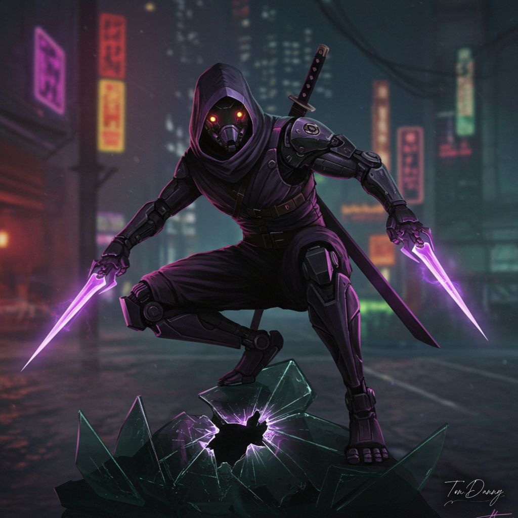 Oil Painting Ninja-shaped Robot Cyberpunk Style The robot crouches on a shattered glass monument in the darkness, its sleek Black and Violet body covered in lightweight, segmented armor designed for stealth. Its arms are equipped with retractable plasma daggers, and its back houses a pair of energy shurikens glowing faintly with purple light. The angular headpiece features glowing yellow optics and an integrated targeting system. The background reveals a dimly lit Cyberpunk city with neon signs flickering in the fog, casting eerie shadows.