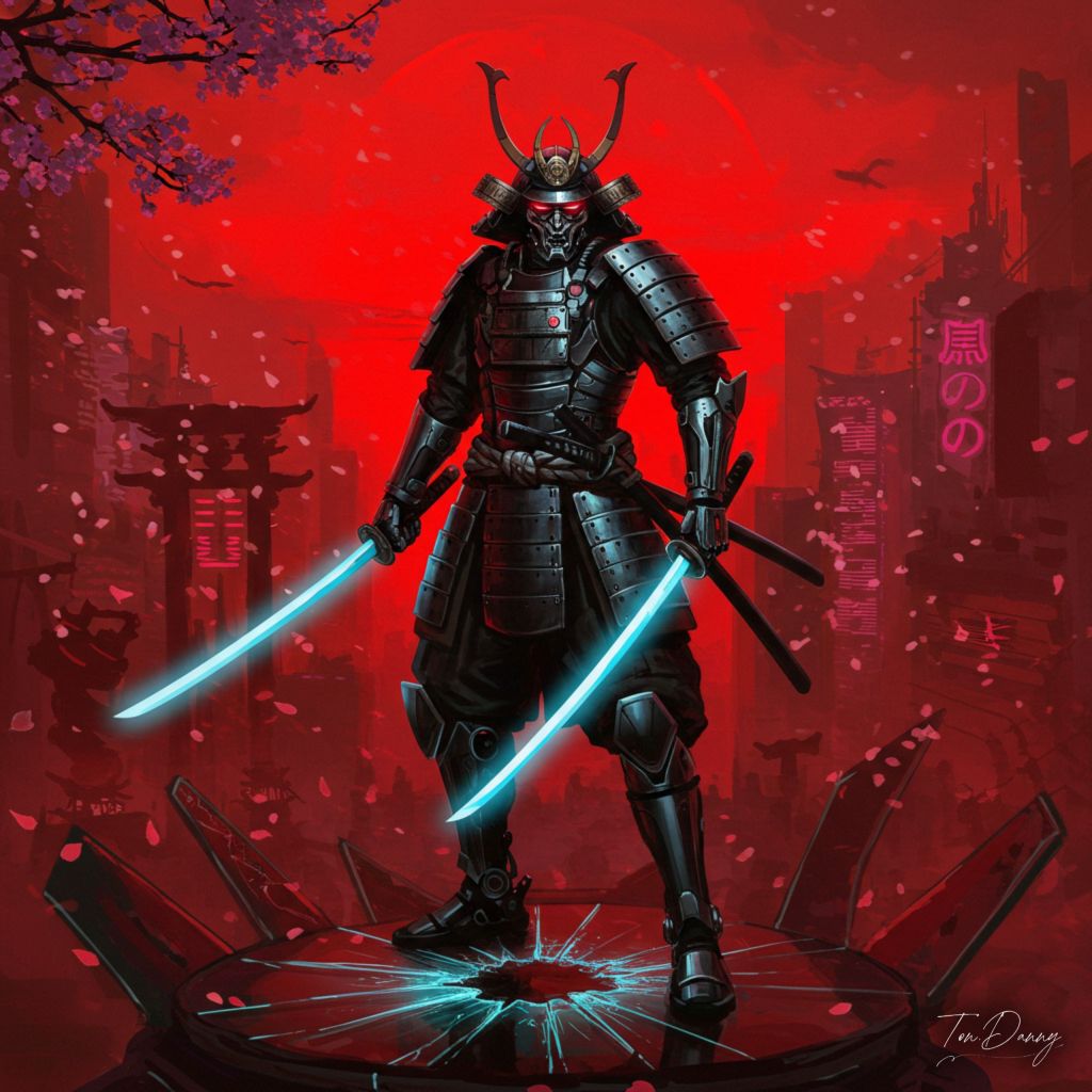 Oil Painting Samurai-shaped Robot Cyberpunk Style The robot stands solemnly atop a cracked glass monument under a blood-red sky, its Black and Chrome body encased in layered, angular armor resembling traditional samurai plating. The arms wield dual plasma katanas that glow with blue energy, while its back is adorned with a sheathed energy blade. Its headpiece features a sharp, horned kabuto design with a glowing crimson visor. The background shows a Cyberpunk metropolis shrouded in neon red mist, with holographic cherry blossoms falling through the air.