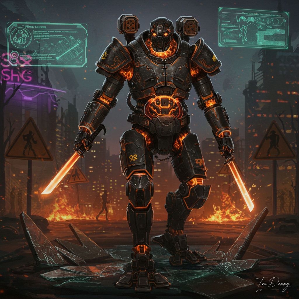 Oil Painting Mercenary-shaped Robot Cyberpunk Style The robot strides confidently across a shattered glass monument, its heavily armored Black and Orange body glowing with molten energy conduits. Its arms wield dual plasma short swords, while a massive energy cannon is mounted on its back. The headpiece is angular with glowing orange optics and a retractable face shield. The background shows a Cyberpunk wasteland illuminated by flickering neon flames and holographic warning signs.