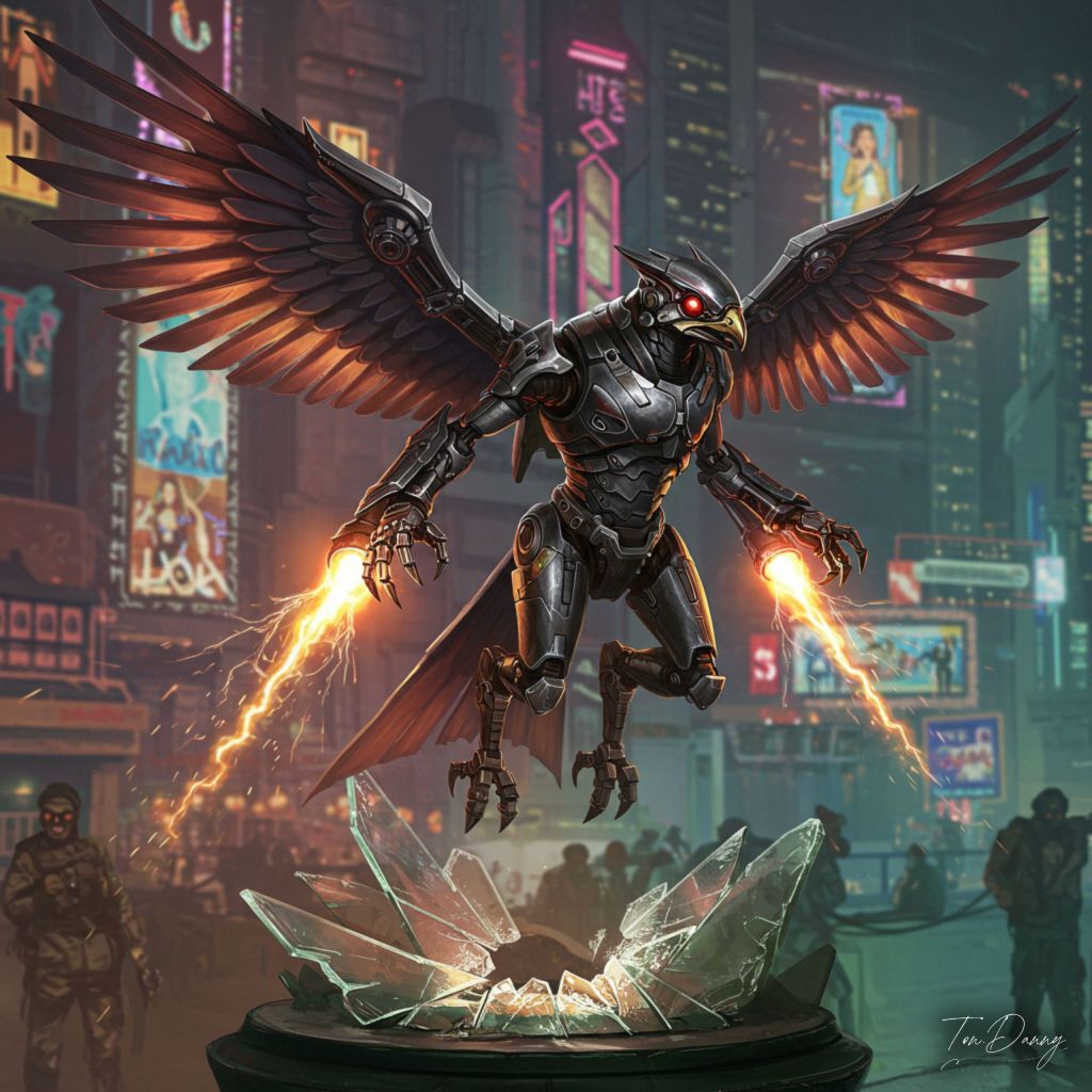 Oil Painting Falcon-shaped Robot Cyberpunk Style The robot soars above a shattered glass monument, its sleek Black and Silver body reinforced with angular armor and glowing propulsion jets. The wings are sharp, mechanical constructs with plasma exhaust vents, leaving trails of glowing heat in the air. Its talons are fitted with plasma claws, and its head features a glowing red visor. The background shows a Cyberpunk metropolis glowing with flickering neon lights and holographic advertisements.