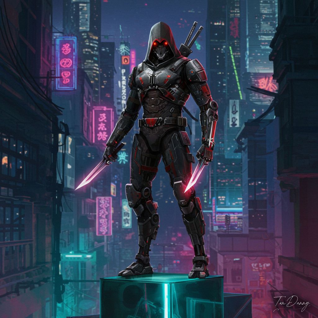 Oil Painting Assassin-shaped Robot Cyberpunk Style The robot stands silently atop a glass monument bathed in neon shadows, its lightweight Black and Crimson armor tailored for speed and precision. Its arms are equipped with dual plasma daggers, while a retractable energy blade is mounted on its forearm. The headpiece is sleek and angular, with glowing red optics designed for night vision. The background features a Cyberpunk cityscape filled with towering neon-lit skyscrapers and shadowy alleys.