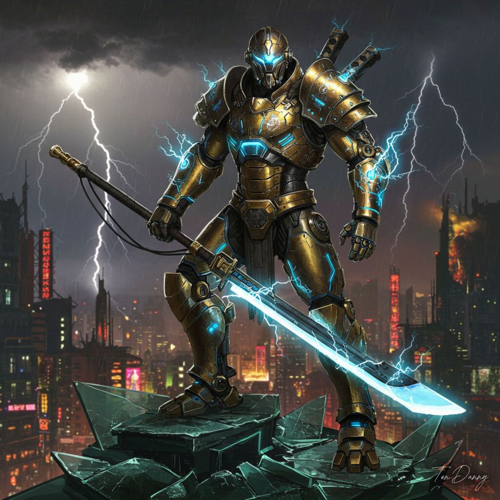 Oil Painting Ronin-shaped Robot Cyberpunk Style The robot stands against a stormy skyline on a fractured glass monument, its heavy Gunmetal Gray and Gold armor glowing with streaks of blue lightning energy. It wields a massive plasma naginata that sparks with electric arcs, while its armored legs are reinforced with hydraulic stabilizers. The headpiece features a rugged, horned design with a glowing blue visor. The background depicts a Cyberpunk city consumed by a thunderstorm, with lightning illuminating the darkened streets below.