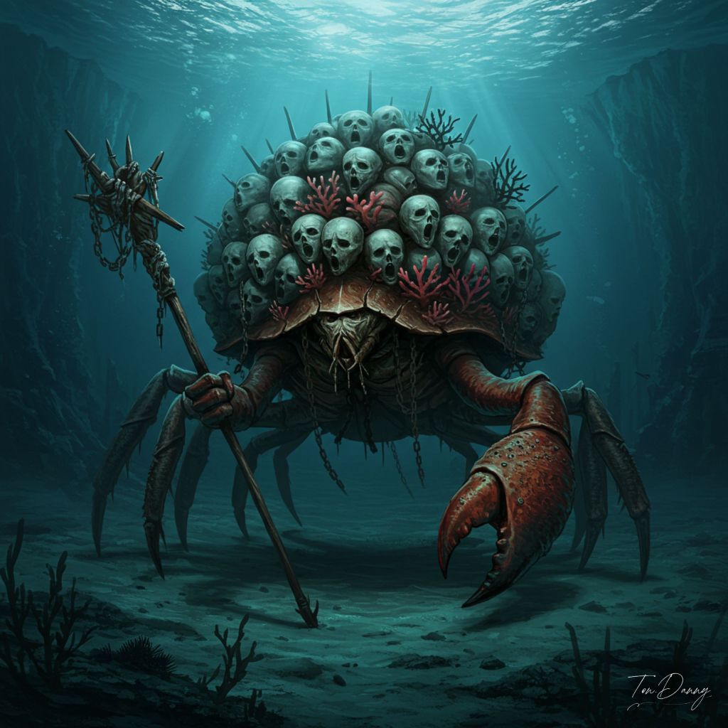 Lurking in the pitch-black depths of the ocean trench, this hunched, crab-like priest crawls solemnly across the seabed, its chitinous shell fused with rusted bells, coral thorns, and encrusted chains. Shrouded in the weight of forgotten prayers, it follows in the wake of its master—Bell-Naive—echoing the silent toll that erases names from the world above. The creature’s massive back is lined with rows of eyeless, human-like faces, twisted in eternal whispers. Their murmurs—unintelligible, mournful—resonate through the pressure-thick water like the last memories of drowned souls. In its clawed hands, it clutches a staff made from the shattered mast of a lost ship, the tip ending in a barnacle-covered tuning fork that vibrates with inaudible resonance. Wherever it crawls, history unravels. Wherever its bells hum, memory fades. It does not preach. It tolls for those who no longer exist.