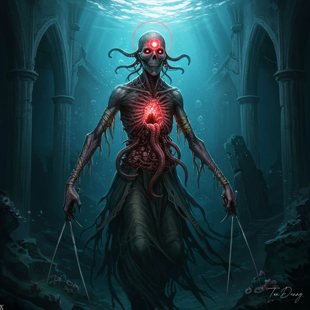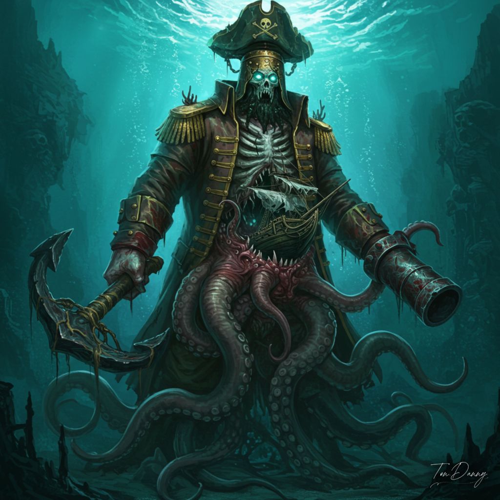 Towering in the hadal depths like a drowned god of ruin, this monstrous figure wears the ragged semblance of a legendary pirate captain—but grotesquely enlarged and mutated beyond comprehension. Its skeletal frame is wrapped in a decayed admiral’s coat, overgrown with kelp and coral, while a massive, cracked bell-helm engraved with alien oceanic runes obscures its face. Faint pulses of abyssal light flicker from within the helm, echoing a toll no ears can hear. From its bloated abdomen gapes an enormous, vertical maw lined with rows of jagged, lamprey-like teeth. A once-grand pirate ship is caught halfway inside, its hull crushed and masts splintered, slowly pulled deeper by writhing tentacles that spill from the mouth like digestive feelers. Its right arm ends in a massive naval cannon—rusted, blood-stained, and bolted directly into torn flesh. Its left hand clutches an anchor the size of a small tower, encrusted with bone, barnacles, and sunken chains—wielded like a great hammer of the deep. Below its torso, humanoid form gives way to a mass of thick, octopus-like limbs that root it to the trench floor, writhing in restless silence. It does not walk. It creeps like a nightmare. It does not speak. Its presence tolls like the end of memory itself. Those who hear the bell vanish—not into death, but into erasure. They are unremembered. Unwritten. Swallowed by the captain who devours not flesh… but legacy.