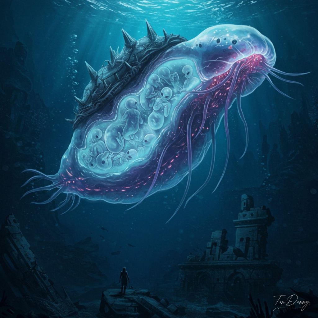 Resembling a colossal, translucent sea slug, this abyss-dwelling entity drifts slowly through the crushing darkness of the ocean’s deepest trenches. Its gelatinous body glows faintly with cold starlight hues of violet and icy blue, casting eerie luminescence across the ruins of forgotten civilizations on the seafloor. Upon its back lies a massive crystalline womb-like chamber, within which hundreds of faceless alien embryos float in silent, dreamlike suspension. Ominous tendrils extend from its body, releasing hypnotic pheromones that seep through the currents, luring the desperate and the broken into its presence. In exchange for a chance at rebirth, it demands offerings of flesh, memory, and identity. None know what transformation occurs within the chamber—but those who return are forever changed, hollow-eyed, and mute, bearing an unsettling serenity.