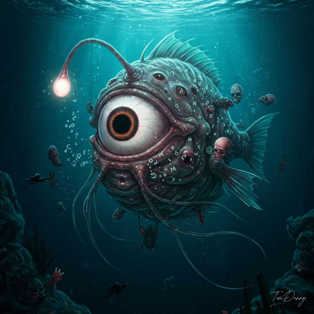 Lurking at the bottom of an unmapped trench, this entity resembles an enormous, grotesque anglerfish fused with a single, bulbous eye that dominates its entire face like a deep-sea telescope. Its eye protrudes like that of a monstrous goldfish, the iris formed from swirling, bio-metallic rings that spin in unnatural directions. Translucent fins drift slowly through the pressure-crushed water, trailing luminescent threads that resemble neural pathways. Encircling its bloated form is a slow orbit of severed limbs, ossified organs, and alien symbols, suspended in the abyss as if frozen mid-formula in a cosmic equation. It does not swim—it drifts with ominous calm, gazing through time and memory. Any creature that meets its gaze is struck by a moment of unbearable clarity, a surge of pure truth so overwhelming that it collapses the mind into permanent stillness. No blade or bomb can harm it. It does not need to fight. It already knows how everything ends.