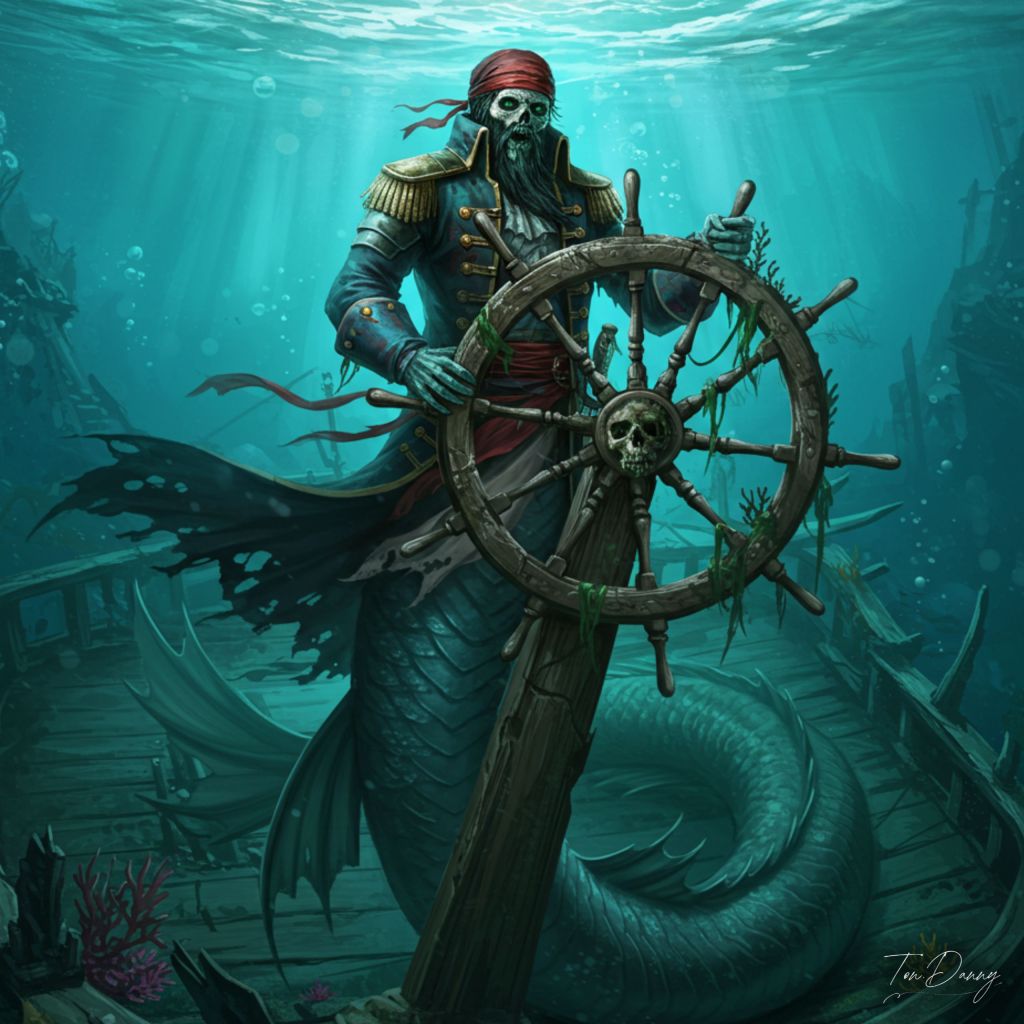 Beneath the lightless pressure of the abyss, atop the decayed deck of a long-forgotten galleon, looms the spectral form of Ilvaarn—once a legendary pirate admiral, now a fused relic of the sea and its silence. His upper body retains the grandeur of command: clad in barnacle-crusted armor and a tattered officer’s coat, its gold thread faded to green with algae. His face is gaunt and deathless, bound in an ornate, jewel-studded bandana that drapes down like a funeral cloth, hiding hollow eyes that once stared down fleets. His lower half has transformed into the coiling tail of a deep-sea beast—scaled, ridged, and crowned with sweeping fins that sway like banners in the still water. His body merges with the shattered ship beneath him, planks and beams tangled with coral and spine, as if he is both captain and coffin. Gripped tightly in both hands is a massive, barnacle-encrusted wooden ship’s helm—a captain’s wheel long stripped of purpose. One hand clutches the edge as if steering, while the other steadies the heavy shaft. It is no weapon, but a symbol—a cursed relic of control lost to the abyss. From its spokes, seaweed trails like ribbons, and within its cracks dwell whispering barnacles that repeat forgotten orders in garbled tongues. Ilvaarn does not walk. He drifts like judgment, guided by a helm that no longer turns. He does not speak. But all tides shift when he passes. Where he steers, memory drowns.