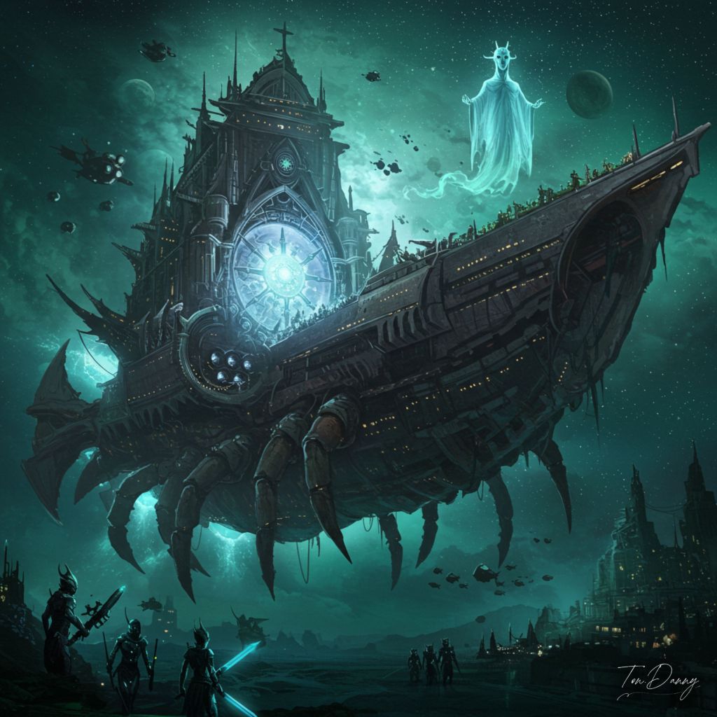 A gargantuan deep-space vessel, resembling a fusion of a cathedral, a crustacean, and a war relic, sails through the stars and under the oceans of drowned worlds. Its crew—a mix of alien outcasts, exiled AI minds, and hybrid monsters—live by a single rule: “Take from the old gods before they wake.” The ship’s core is sentient, whispering heretical truths, guiding them to places even empires fear. At its helm, a ghostly navigator with an abyssal mask steers through temporal rifts, seeking the next city to plunder—or sacrifice.
