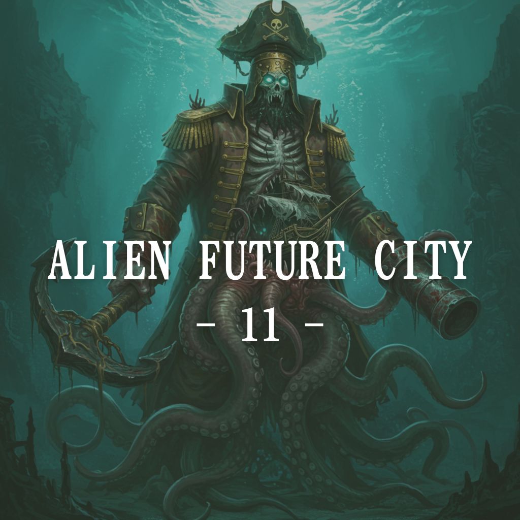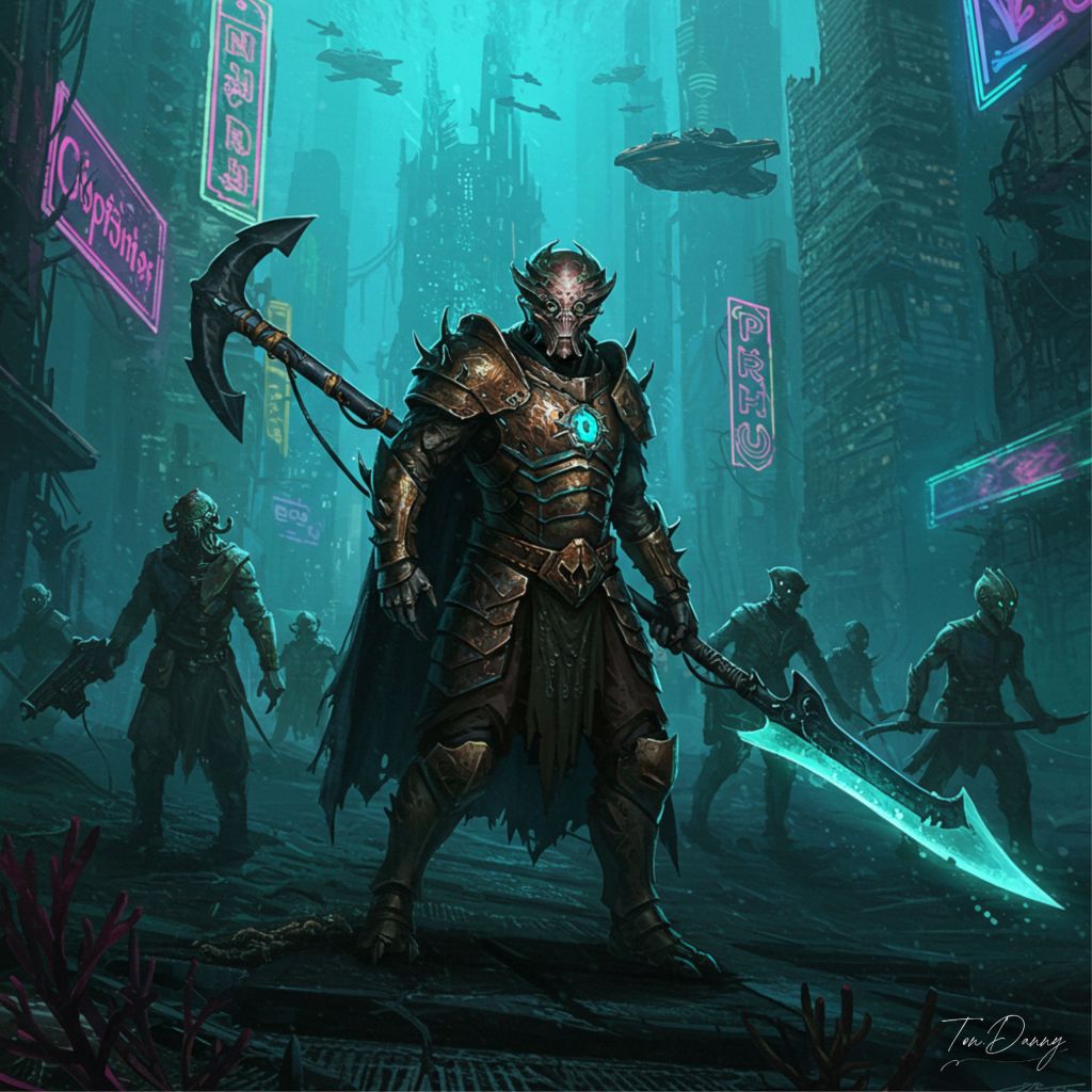 In the heart of a drowned future metropolis, illuminated by decaying neon and glowing abyssal towers, a notorious alien pirate crew descends from their barnacle-encrusted void cruiser. Clad in corroded armor patched with synthetic sea-beast hide, they move through the ruins with predatory precision. Their captain, a towering figure with a biomechanical eyepiece and a spine of exposed cables, wields a gravity-forged anchor-saber, while his crew of amphibious mutants and cybernetic looters tear through what remains of the city. They do not steal for riches. They collect secrets—and they know this city hides a slumbering god beneath its core.
