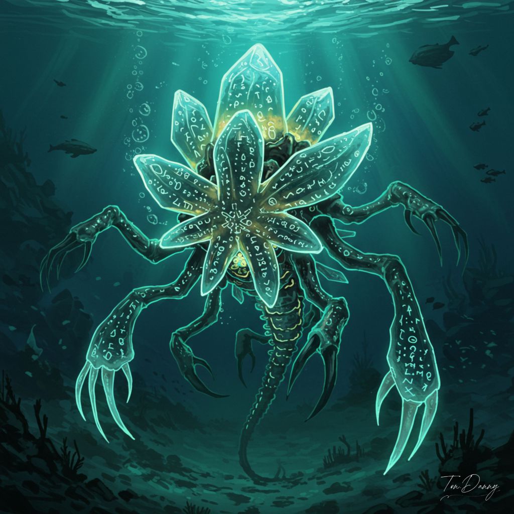 An ancient bio-symbol given form, Ze=Iglos is a living sigil, etched across its own asymmetrical, crystalline carapace. Its body is composed of glowing hieroglyphic plates, slowly rotating around a core that flickers like a dying starfish heart. Its limbs defy symmetry; some end in cipher-like claws, others split into subliminal symbols that imprint onto the ocean floor like a ritual tattoo. Wherever it moves, meaning itself breaks down—language, math, time—no longer function. It does not destroy with force. It unwrites.
