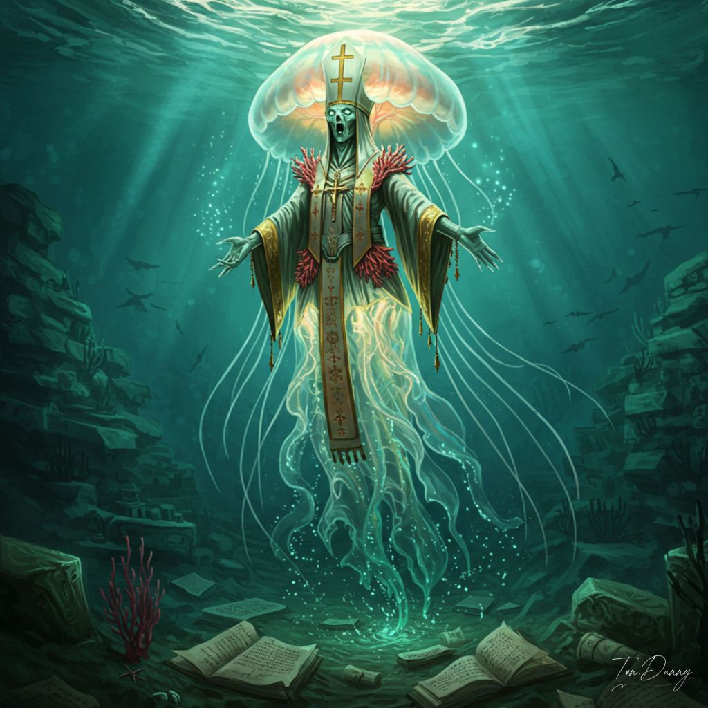 Floating above a trench of rotting holy scrolls, this being resembles a jellyfish-shaped high priest, its upper body humanoid and adorned in decaying religious regalia made of transparent scales and coral-thread. Its lower half is a massive, pulsating veil, trailing streams of glimmering ink that rewrite the sea’s memories wherever it passes. The Liturgist speaks in echoing psalms, reshaping reality according to a scripture long since lost. Each syllable spoken unravels the identity of those who hear it, until their minds become blank pages—ready to be rewritten.