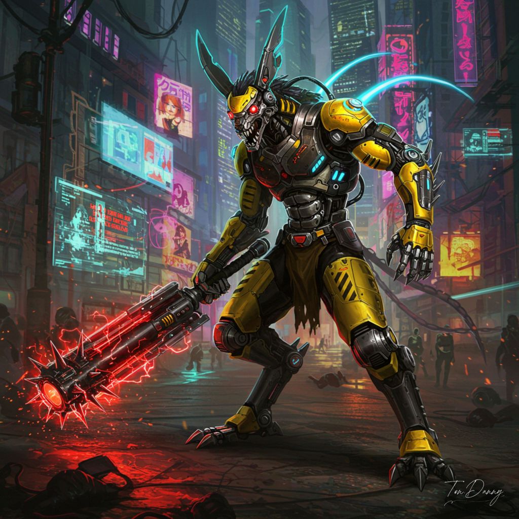 Oil painting, Cyberpunk atmosphere in a neon-drenched dystopian city. A towering cybernetic beast-warrior, its sleek exoskeleton a striking combination of yellow and black, stands amidst the neon chaos. His elongated, razor-sharp metallic ears, resembling antenna-like energy blades, extend far behind him, pulsing with a menacing blue glow. His piercing neon-red cybernetic eyes scan the battlefield, locking onto his next target with ruthless precision. His body is a fusion of machine and beast, encased in layered black armor plating with yellow hazard-stripe patterns, emphasizing his industrial, battle-worn design. Glowing energy conduits pulse along his reinforced limbs, while his digitigrade legs, equipped with kinetic stabilizers and thruster-enhanced joints, ensure unparalleled speed and agility. His clawed fingers, tipped with reinforced talons, crackle with residual static, and his segmented, bladed tail hums with raw power, shifting like a weapon ready to strike. In his hands, he wields a colossal cyber-enhanced spiked bat, nearly as long as his entire body. The weapon’s black metal frame pulses with crimson neon energy, while razor-sharp spikes lined with embedded plasma conduits crackle violently with an unstable charge. Each swing leaves behind a searing red afterimage, carving through the smog-filled air with a deep mechanical hum. The background is a war-torn cyberpunk cityscape, where massive holographic billboards flicker with corrupt data, displaying messages like “SYSTEM FAILURE” and “IDENTITY COMPROMISED.” The streets below are littered with broken drones and shattered android husks, illuminated by glowing pathways and shifting digital graffiti, marking gang-controlled zones. Overhead, skyscrapers with neon glyphs and holographic advertisements loom like silent observers in the decaying metropolis. Lightning arcs through the air as he stands unshaken, his massive spiked bat resting on his shoulder, its neon-red glow casting an ominous hue. A mechanical beast forged for war, he is an unstoppable force in the neon abyss of the cyberpunk underworld.