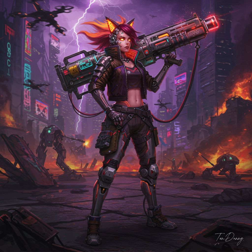 Oil painting, Cyberpunk atmosphere in a neon-drenched battlefield of steel and digital chaos. A fierce, red-haired cybernetic girl with sleek, robotic cat ears stands amidst the ruins of a dystopian warzone, her body built for speed and destruction. Her glowing golden eyes pulse with intensity, scanning the battlefield with machine-like precision, while her flaming crimson hair flows wildly, illuminated by the flashing neon lights of the crumbling city around her. Her sleek cybernetic body, designed for agility, features a metallic exoskeleton with exposed energy conduits. Over her frame, she wears a high-tech armored jacket with integrated energy shielding, draped loosely for a rebellious look. Reinforced mechanical thigh guards and combat boots enhance her mobility, while holographic tattoos flicker along her synthetic skin, shifting with encoded battle data. Strapped across her shoulder is a colossal cyber-enhanced rocket launcher, a brutalist masterpiece of industrial engineering and neon circuitry. The weapon’s frame, lined with pulsating crimson energy conduits, hums with raw destructive potential. Its barrel is reinforced with overlapping mechanical plating, adorned with combat warnings and glitching kill-count readouts. A holographic targeting system flickers to life as she grips the massive weapon with ease, her cybernetic arms adjusting effortlessly to its impossible weight. The battlefield is a wasteland of collapsed skyscrapers, shattered drones, and smoldering neon billboards, some still flashing corrupted messages like “SYSTEM OVERRIDE” and “WEAPON LOCKED.” Overhead, storm clouds swirl with streaks of violet lightning, illuminating the silhouettes of mechanized war-beasts and rogue AIs clashing in the neon-tinged abyss. She stands confident and unshaken, her massive rocket launcher primed for devastation, the neon glow reflecting off her sleek mechanical frame. A cybernetic warrior built for destruction, she is the last spark of chaos in a dying digital world.