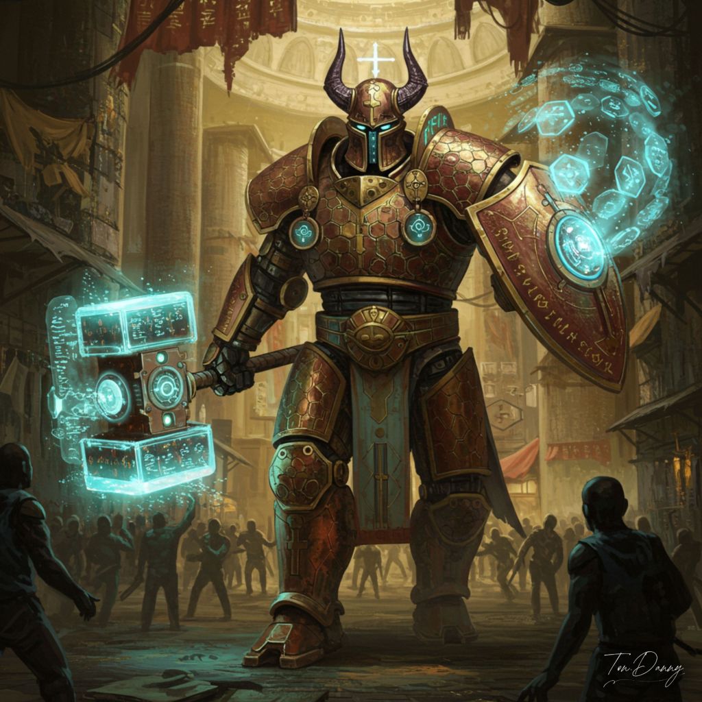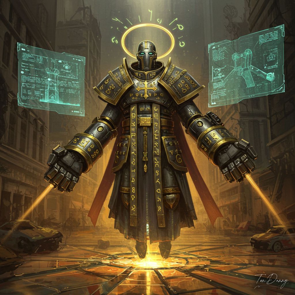 Oil Painting Cleric-shaped Robot Cyberpunk Style A heavily-armored, towering robot, shaped like a digital-era exorcist, marches through a data-corrupted temple in the slums. Its body is adorned with digital scripture panels and hex-grid shield emitters, forming a floating ring of data-plates around its shoulders. It wields a plasma-incantation hammer, releasing waves of blue light upon impact. Holographic “blessings” trail behind it, corrupting enemy code instead of healing.
