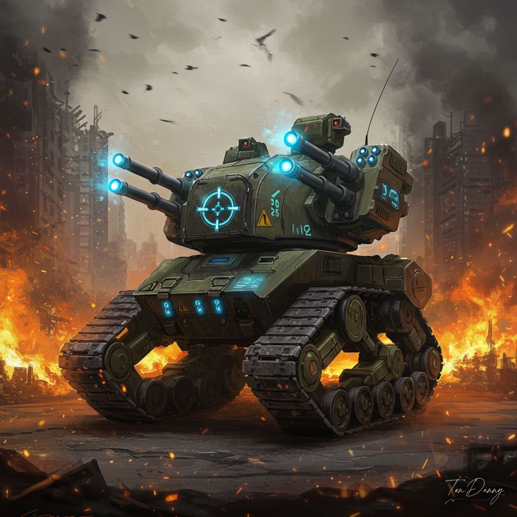 Oil Painting Tank-shaped Robot Cyberpunk Style A drum-bodied artillery unit crawls through a fire-ravaged city block on reinforced tracked limbs. Its cylindrical torso spins slowly, lined with retractable mortars that pulse with blue targeting glyphs. Each explosive volley is synchronized to a rhythmic combat beat emitted from its internal subsonic cannon, disrupting enemy coordination with resonant interference. Its front face displays shifting warning symbols like a digital totem of dread.