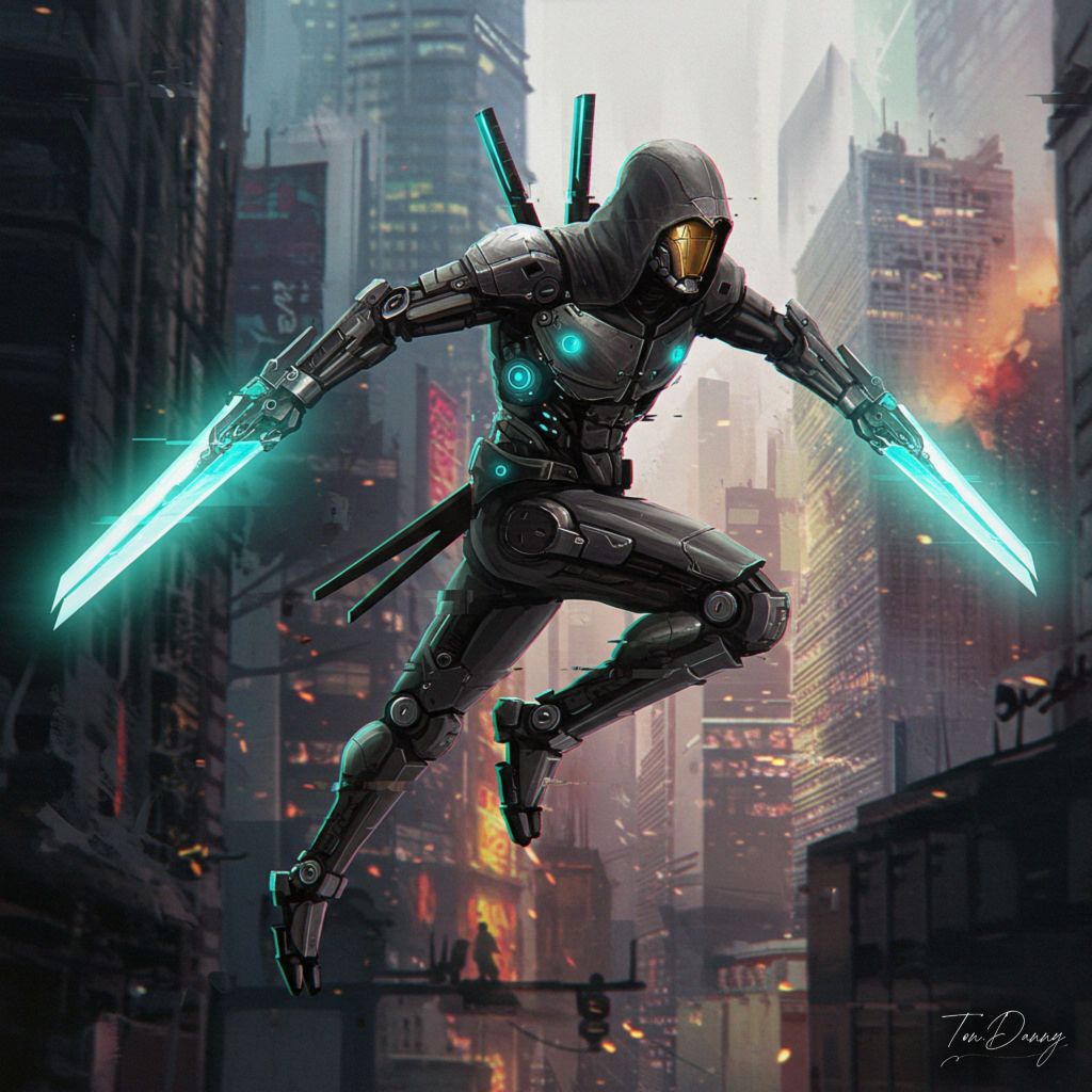Oil Painting Assassin-shaped Robot Cyberpunk Style A sleek, blade-armored robot, built for urban execution, leaps between collapsing skyscrapers. Its arms are fitted with retractable high-frequency cutters, glowing with cyan arcs. Cloaked in a transparent distortion field, it moves in bursts, leaving only glitch-like traces in its wake. As it dashes, its back-mounted energy sheath flashes, revealing the twin blade cores stored in magnetic suspension.
