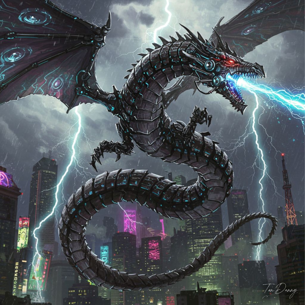 Oil Painting Dragon-shaped Robot Cyberpunk Style The colossal cyber-dragon coils through a storm-wracked skyline, its segmented body forged from obsidian-black armor plating etched with glowing silver circuitry. Wing-blades lined with rotating plasma vents slice through the air, leaving behind trails of static discharge. Its jaw is reinforced with a triple-layered particle cannon, and its spined tail ends in a serrated energy blade. Each roar releases a barrage of arc lightning, splitting neon-lit skyscrapers in half. As it flies, clouds swirl with electromagnetic chaos, and corporate weather towers short-circuit in its wake.