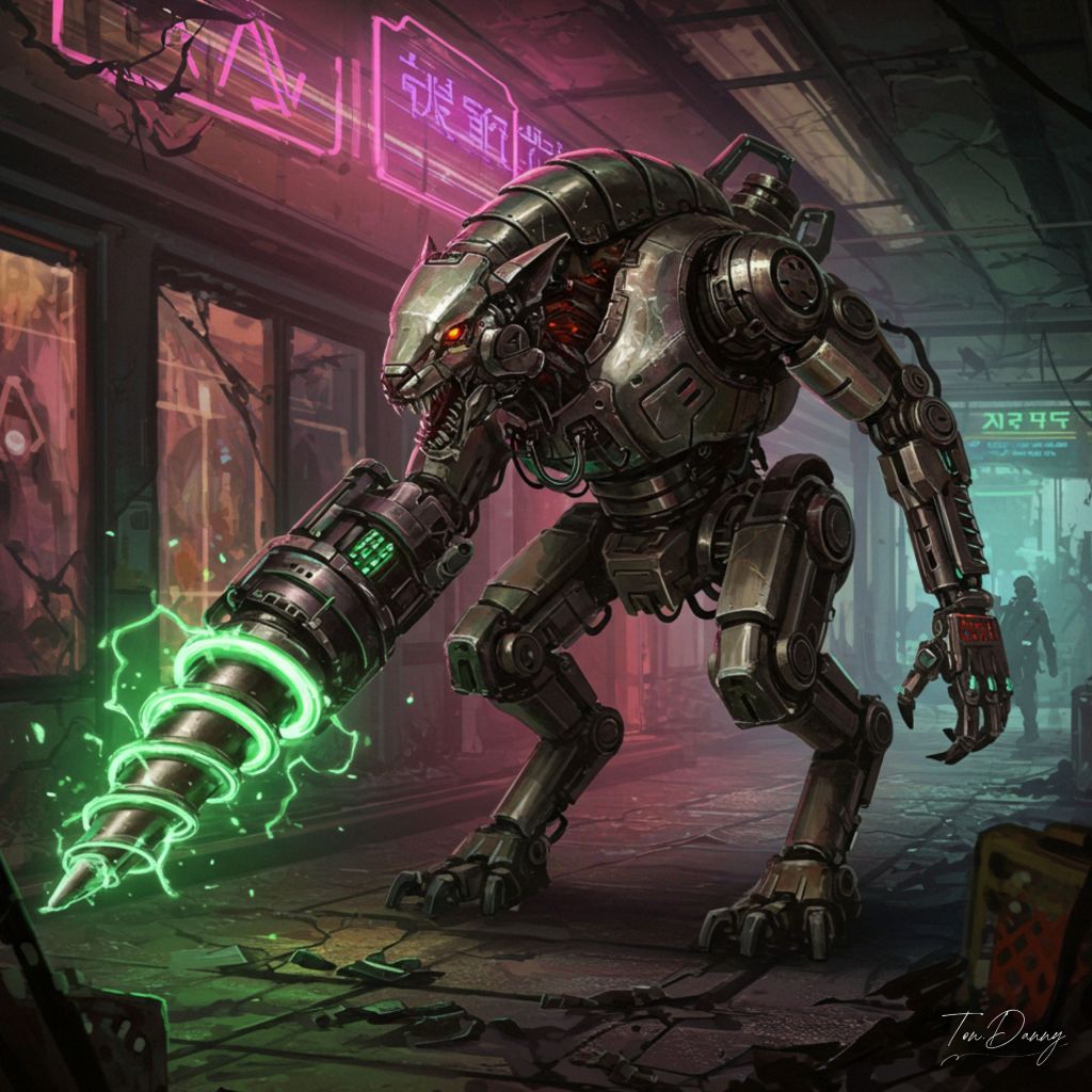 Oil Painting Beast-shaped Robot Cyberpunk Style The colossal quadrupedal cyber-beast, constructed from industrial-grade tungsten plating and rotating actuator limbs, prowls through a collapsed neon subway. Its right arm is replaced with a high-speed cybernetic drill, forged from concentric alloy rings and glowing with green plasma energy. The drill spins silently until engaged, releasing a sonic pulse and high-heat discharge. Its left arm mounts a grapple-tether for debris traversal, while its back is lined with venting exhaust coils that glow in rhythm with its pulse-core.