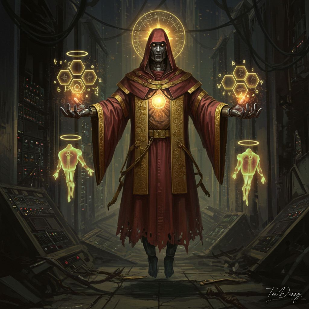 Oil Painting Priest-shaped Robot Cyberpunk Style A floating cybernetic monk, cloaked in ornate, tattered data-tapestry robes, hovers through the remains of a collapsed megachurch server-core. Its hands radiate projection sigils, casting hexagon-shaped data-seals midair. Embedded in its chest is a glowing relic core, streaming corrupted prayers into the city’s network grid. Its voice emits as static-ridden chants, as it summons phantom drones shaped like scripture glyphs, each burning with plasma halos.