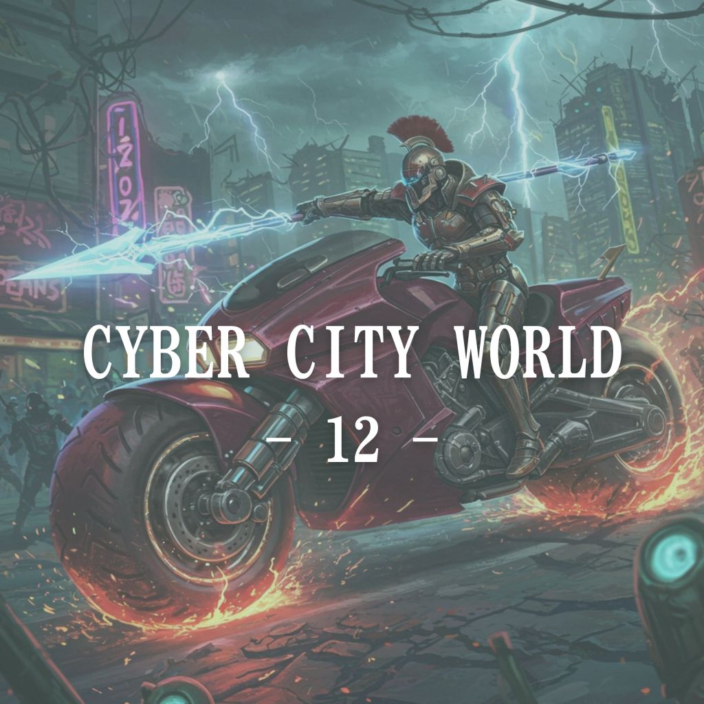 Oil painting, Cyberpunk atmosphere. A massive, wine-red cyber-motorcycle tears through a collapsing techno-jungle, its wheels shattering fractured pavement and sending electric shockwaves through the neon-lit ruins. Arcs of plasma snap across its magnetic suspension, each surge distorting the air around it like heat on metal. The bike’s frame, armored and brutal, hums with violent potential—reactive plating flaring as it powers through walls of bioluminescent vines and shattered synth-glass towers. Atop the machine rides a Spartan-shaped cybernetic warrior, a monolith of titanium alloy and plasma-wreathed circuitry. His posture is forward and low, eyes burning beneath a reinforced helm. In one hand, he wields a thunder-charged spear glowing like a captive lightning bolt, mid-swing toward an unseen enemy. His other hand crushes the throttle, pushing the engine to scream as the street below him breaks apart in his wake. Above, lightning dances through storm clouds tangled with data streams and ruptured billboard gods. The battlefield is chaos, and he is its center—a crimson thunderbolt on two wheels, carving through wreckage and rebellion alike. The city does not stand behind him. It crumbles beneath him.