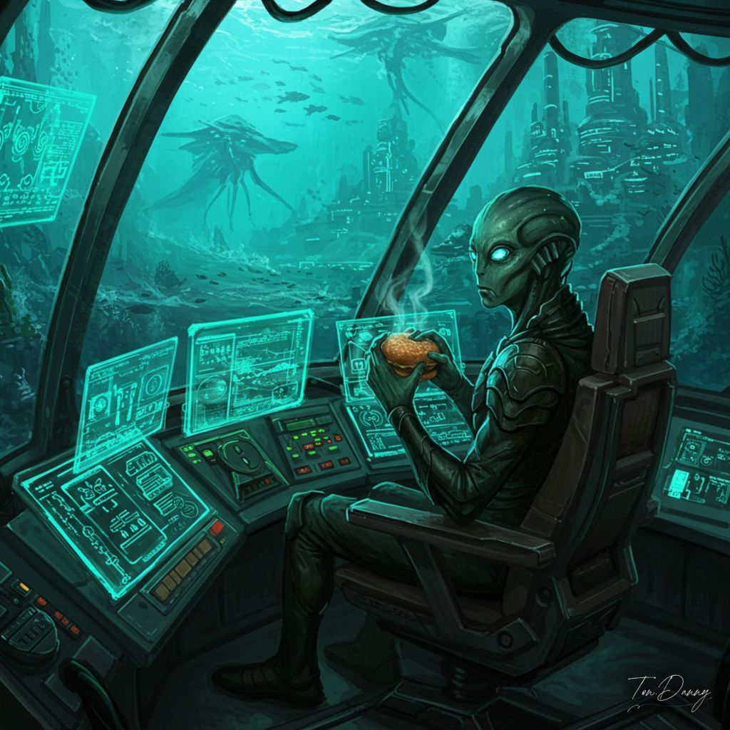 Oil painting, Sci-fi atmosphere in a high-tech cockpit deep within a futuristic oceanic metropolis. A tall, commanding alien scientist, clad in sleek, deep-sea-inspired armor, sits at the heart of a colossal war machine, their bioluminescent eyes flashing as the cockpit erupts into a chaotic storm of data, energy, and motion. The control chamber pulses with raw power, holographic displays flickering with cryptic alien symbols, glowing runes cascading across the curved glass panels like liquid fire. The entire cockpit hums with an eerie, mechanical heartbeat, conduits of neon-blue energy surging through the walls, synchronizing with the alien’s every movement. Outside the reinforced, panoramic canopy, the oceanic metropolis shudders under the sheer force of the awakening machine. Towering bio-mechanical constructs rise from the abyss, their glowing circuitry illuminating the murky depths as distant leviathan-class entities shift in the shadows. Despite the tension, the alien remains effortlessly composed, gripping the control levers with one hand, while the other casually holds a hamburger wrapped in crinkled paper, steam rising faintly from within. The edges of the wrapper are slightly grease-stained, softening the contrast between the sterile, high-tech environment and the utterly mundane act of enjoying a meal. Their sharp, calculating gaze remains locked on the unfolding chaos, as if balancing cosmic responsibility with the simple pleasure of fast food. With a final pulse of raw energy, the entire machine roars to life, shaking the very foundations of the metropolis. Torrents of neon-lit water swirl violently outside as pressure doors burst open, and the war machine ascends from the depths, a titan reborn—its pilot calm, composed, and still enjoying their meal amidst the chaos.