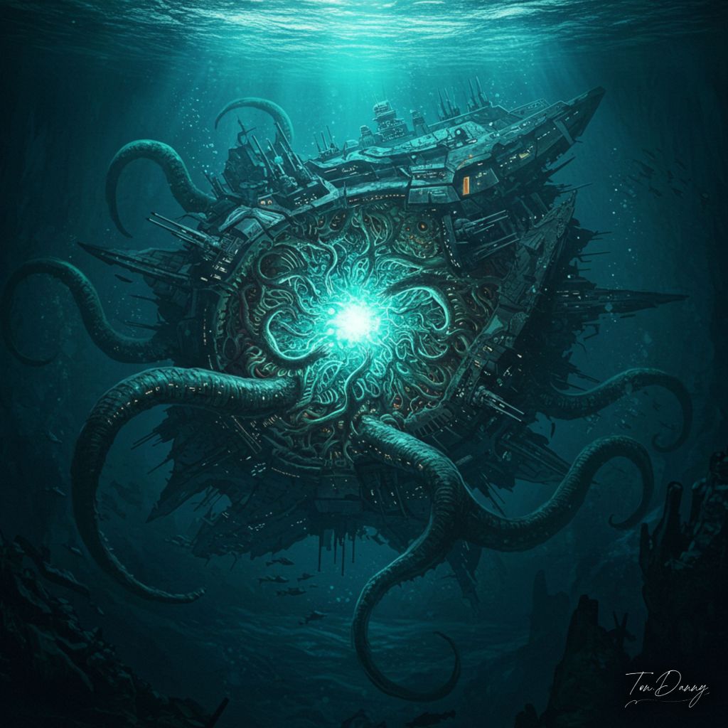Beneath the eternal blackness of the deepest ocean trench, where no light has ever reached, a colossal war machine slumbers—a relic of an ancient, drowned war, forgotten even by those who created it. It is not a ship, not a fortress, but a world-sized god of destruction, a biomechanical leviathan whose form is an ever-fused mass of war-torn vessels and abyssal ruins, its plated surface composed of fractured deep-sea citadels and the skeletal remains of sunken fleets, still marked by the insignias of extinct civilizations. Its core is not a reactor, but a dying celestial abyss, its power sealed within ribbed, metallic conduits that pulse like a rotting heart, held together only by decaying biomechanical veins. Deep within, twisting, coral-like formations of neural circuitry spread like tumors, overgrowing the once-pristine war machine, embedding themselves into its labyrinthine superstructure. The ocean around it does not flow naturally. The very currents obey its slumber, forming spiraling vortexes, as if the abyss itself is caught in an eternal gravitational pull, bending reality to its dormant will. It does not wake on its own. It only awakens when war begins anew. When conflict stirs above the abyss, when civilizations dare to wage war, the machine stirs. Jagged, plated appendages, once buried beneath eons of silt and wreckage, begin to shift. Organic-metallic tendrils, resembling the skeletal remains of deep-sea leviathans, extend outward, reconnecting the ruins of its past, activating forgotten war protocols inscribed in alien script. It does not need to hunt. It does not need to conquer. The moment it rises, war ends—not because of a decisive battle, but because the world above ceases to exist.