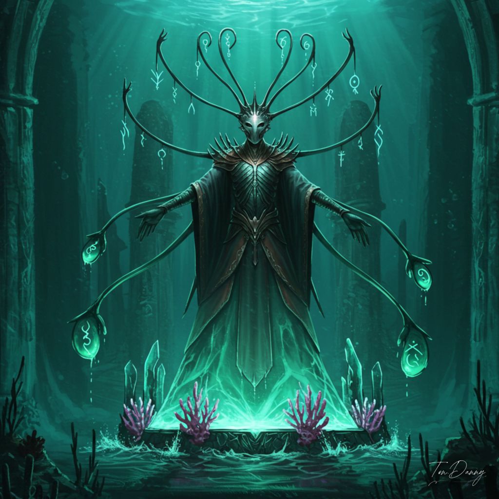 In the shadows of a submerged city-temple, an alien high priest of the abyssal cult stands atop an altar of shifting metal and glass coral. Its body is draped in a flowing mantle woven from leviathan nerve-fibers, and its face is hidden behind a mask etched with pulsing abyssal runes. On its back writhe living antennae, each one inscribed with a different symbol of forgotten sea gods. With every motion, it brands the water itself, marking new territory for the rising deity. Around it, the water grows thick and luminous, and in its presence, reality becomes pliable, as if the priest is already shaping the ocean into the god’s image.