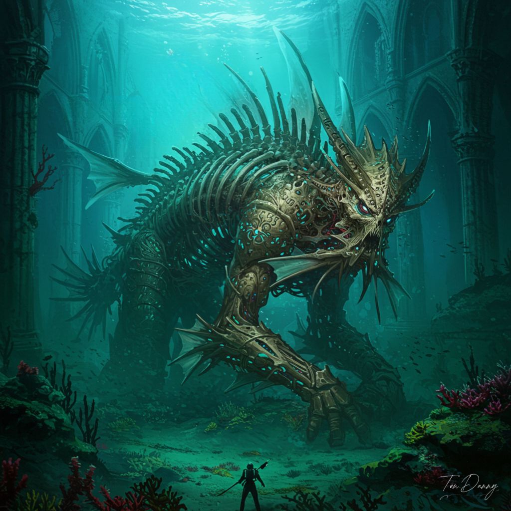 In the ruins of a sunken alien cathedral, overgrown with fossilized coral and blood-colored algae, a colossal entity slumbers. Its body is made of entangled skeletal remains of long-dead sea gods, fused into a living biomechanical monument. Its surface is covered in ritualistic armor shaped like ancient sea crustaceans, engraved with language no longer recognized by machines or minds. From its back extend towering fin-spires, shimmering like translucent bone, and its lower half spreads like a reef, slowly converting the seafloor into its growing domain. Alien divers who wander too close are never found again. Their last transmissions speak of a voice that sings in the bones of the ocean, calling them home.