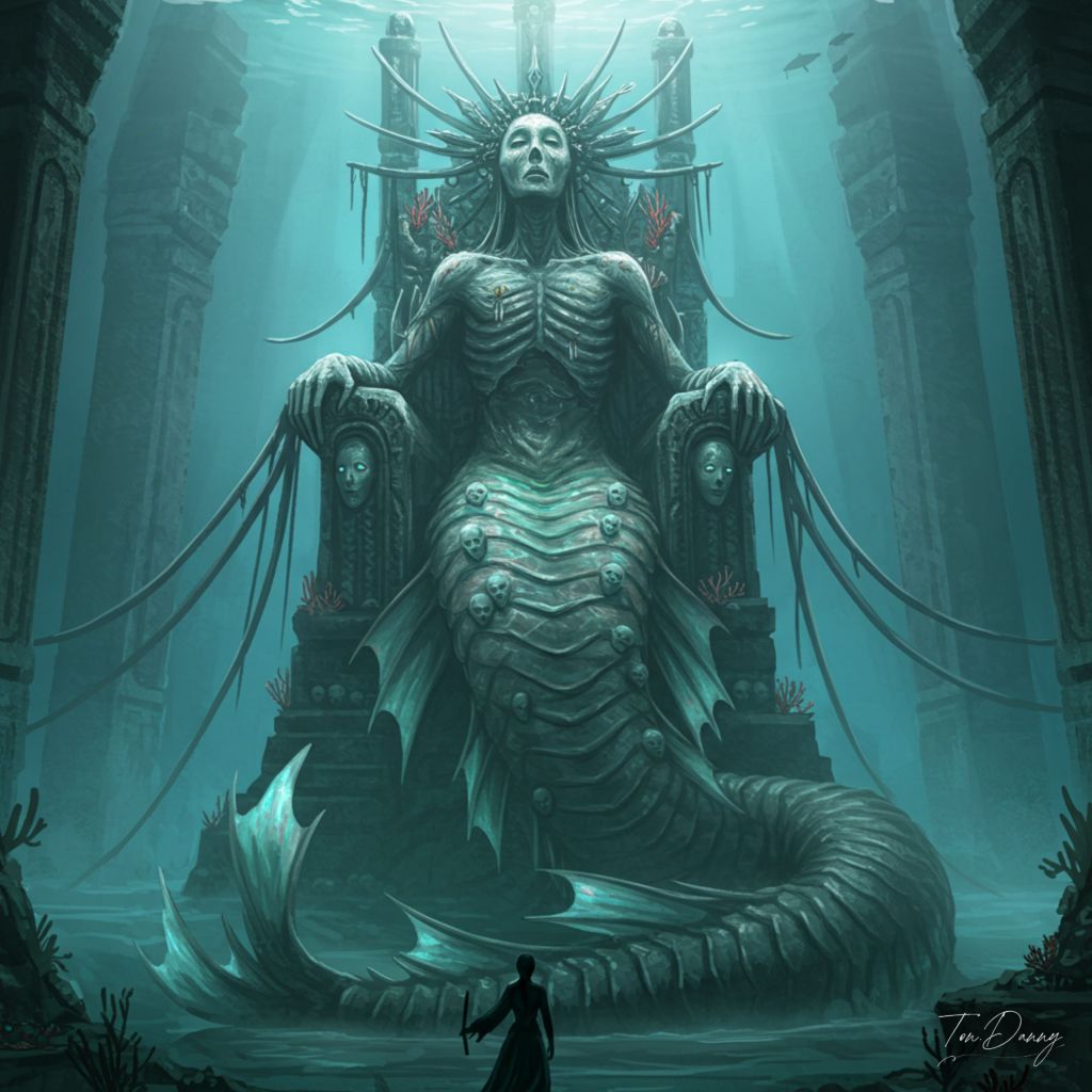 At the center of a fog-choked, drowned trench-city, carved from the bones of forgotten sea gods, a slumbering figure sits atop a throne of calcified divine flesh. Its upper body is vaguely humanoid, yet lacking all detail—a silhouette of melted relics, smoothed coral, and eroded offerings, as though shaped by memory more than by hand. Its head bears a solemn prayer mask: one eye eternally open, ever-watching the ocean’s despair; the other forever sealed, as if guarding a truth not meant to be known. From its arms extend long, ribbon-like biomechanical strands, each one terminating in a ceremonial blade, rusted with use, designed not to kill, but to anoint the sea itself. Below the throne, its lower half stretches into an immense, piscine tail—not elegant, but withered and sacred, armored in layered, barnacle-encrusted scales, resembling a fossilized mermaid-god. Fins made of glowing glass-membranes gently sway in the still water, and its tail coils endlessly into the temple floor, anchoring it like a holy root grown into the bones of the city. Alien pilgrims approach in silence, drawn by dreams and desperate prayers. None ever return. But each time the fog clears, there are more faces carved along the king’s ribcage, silent and praying, as though they have been accepted into its eternal congregation.