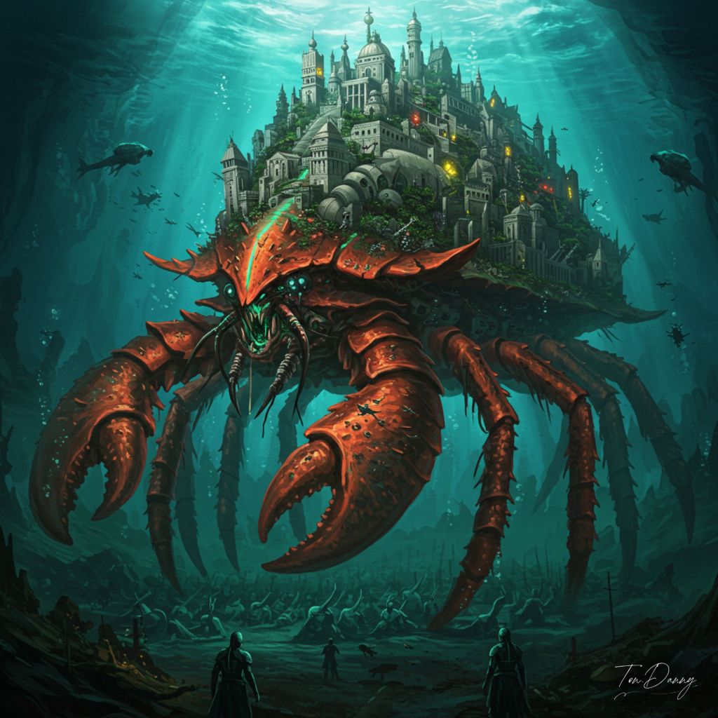 Legends speak of a colossal, crustacean-shaped god, wandering the lowest levels of the alien sea like a living temple, its shell encrusted with entire cities, broken satellites, and shrines built by extinct species. Its countless legs are segmented pillars, each one containing crypts, reactors, and flowing rivers of alien ichor. Its head bears no mouth, but a halo of abyssal flames, and from its underbelly stretch rows of half-formed apostles, still whispering forgotten scriptures in drowned tongues. Where it walks, the tides collapse, and stars go quiet.