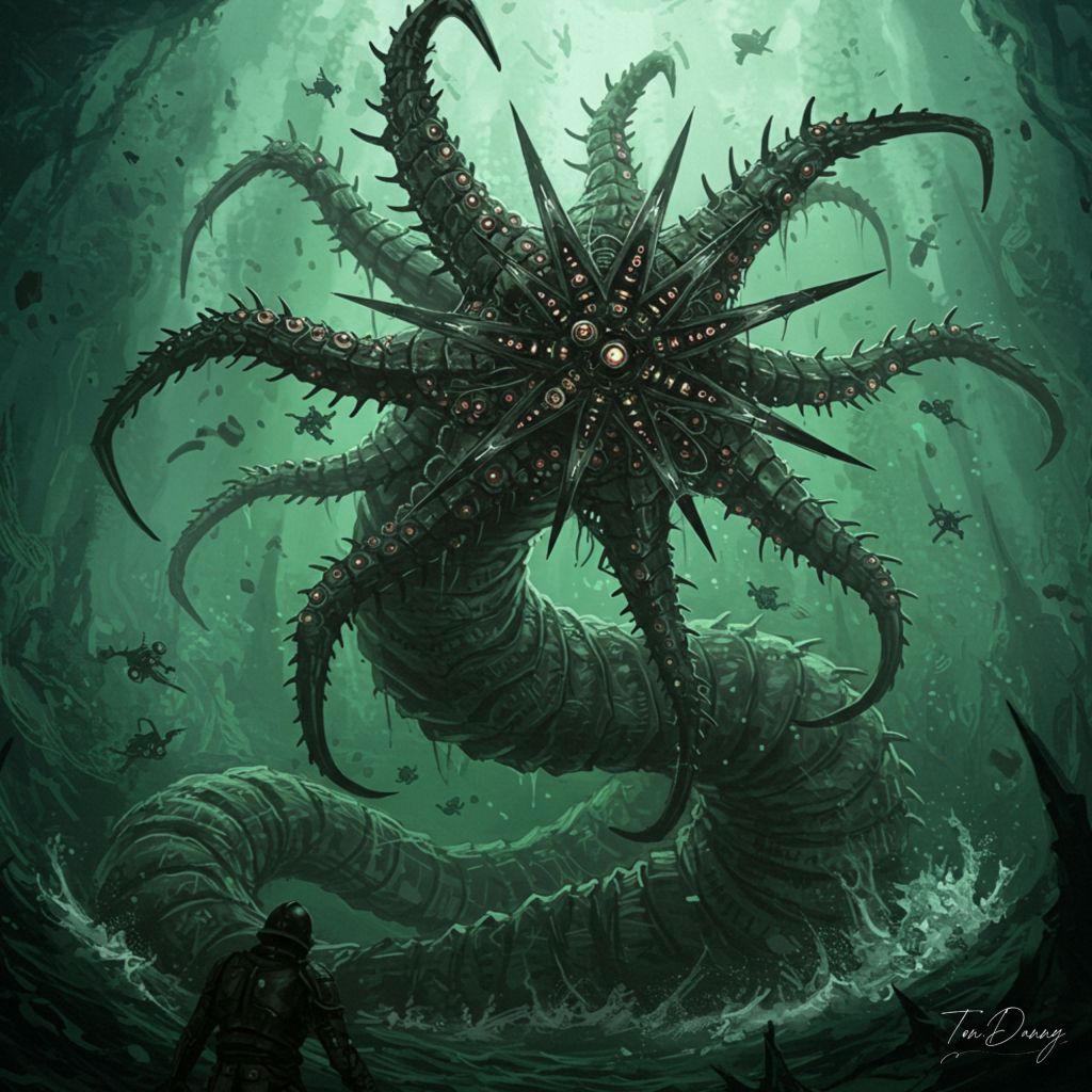 Birthed from the collision of a swarm intelligence and a drowned machine god, Hadalvome rises from the hadal trench as a writhing, collective consciousness, its form composed of millions of segmented drones, fused into a single biomechanical body that undulates like a living sea. Its core is a massive, rotating starfish-shaped core, every arm lined with spiked eyes that emit signals in ancient languages. As it moves, its smaller components detach and reform, acting as both weapons and rebuilding units. No one fights it directly. Because to touch it is to be reassembled.