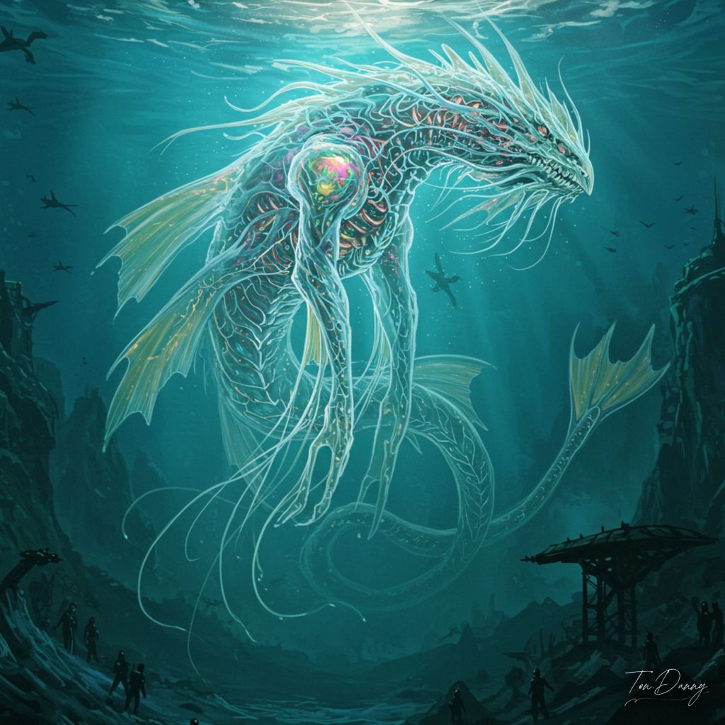 This towering dragon-like entity flows through the trenches like a lucid nightmare, its form composed of translucent plating wrapped in glowing neural veins, revealing a sleepless, data-fed core in its chest. It does not swim—it floats in the folds of perception, phasing between realspace and dreamspace, releasing streamers of psycho-reactive tendrils that alter the minds of nearby lifeforms. Entire cities have fallen, not by battle, but by the collective sleepwalk of their people into the ocean, whispering its name.