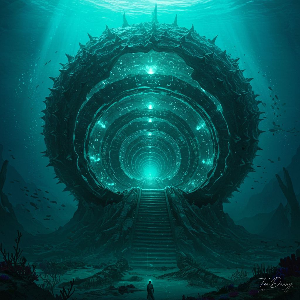 Rising from the seafloor like a living mountain, this biomechanical temple-creature is shaped like a titanic, inverted shell, its spiraled corridors pulsing with ritual data streams and flickering memory-specters. Inside the shell is no god, only an endless descent—every chamber deeper than the last, each level more unstable, as if the creature is still growing downward into unreality. Pilgrims who enter return either mad, changed, or as part of the shell itself.