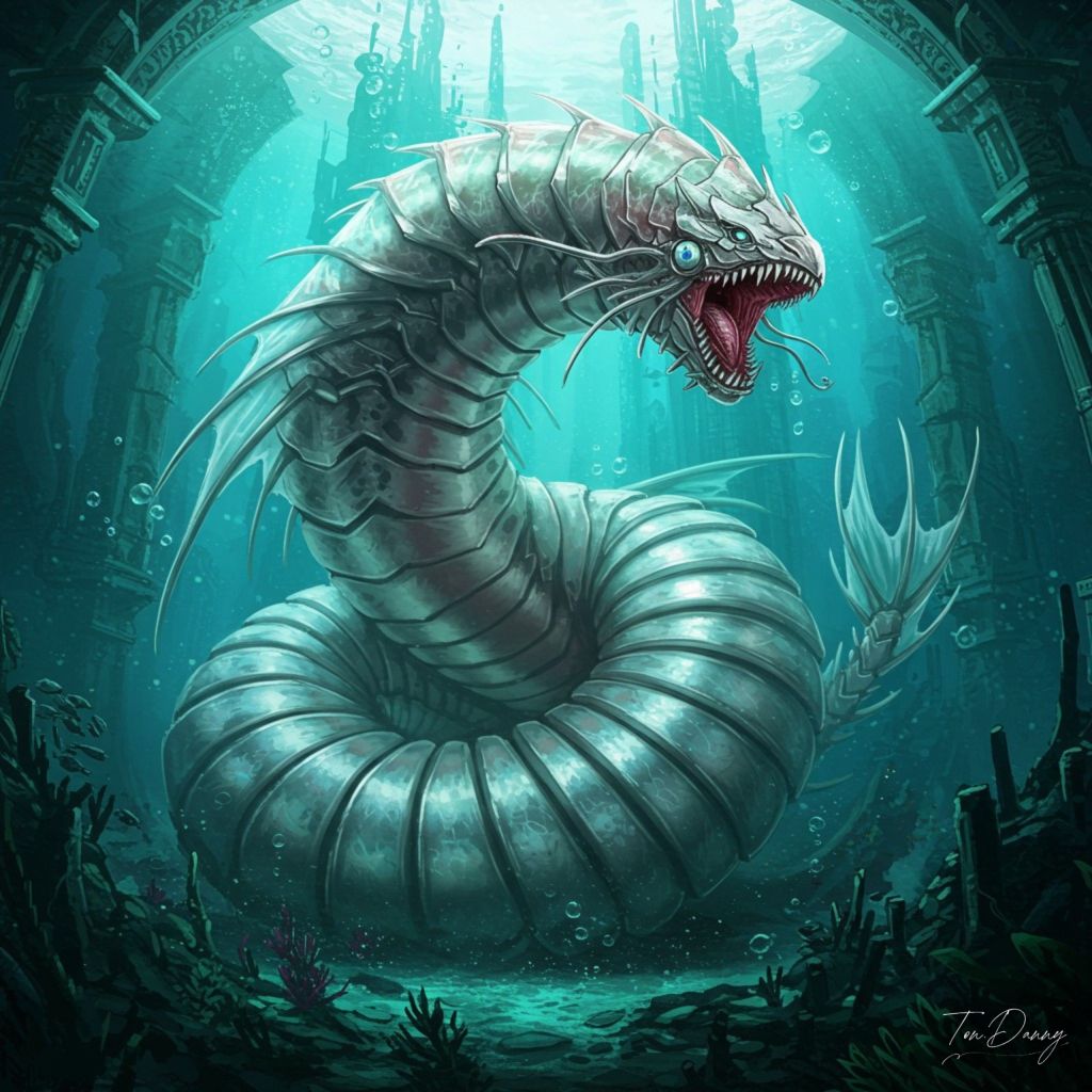 In the heart of a long-forgotten underwater temple, a titanic biomechanical creature resembling a fusion of a coiled sea serpent and a coral fortress lies dormant. Its body is wrapped in layers of smooth, nacreous armor, segmented like the spirals of an ancient shell. When intruders disturb the sacred waters, the guardian’s body unfurls with thunderous force, revealing inner layers of bladed fins and a cyclopean eye embedded in its chest that emits beams capable of disrupting molecular bonds. Its roar vibrates through the alien metropolis above, a reminder that some sanctuaries were never meant to be entered.