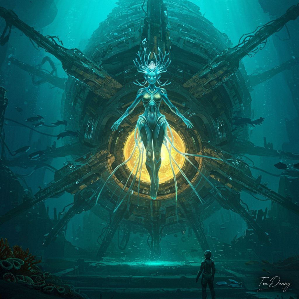 At the center of a sunken alien sanctuary, a bioluminescent, jellyfish-like alien priestess interfaces with a colossal submerged construct resembling a sea anemone fused with a reactor core. Her body is composed of semi-transparent plating and crystalline exoskin, her head crowned with orbital antennae resembling coral spirals. With every movement of her arms, the machine-city awakens, shifting its structure like a living organism. She does not speak. Her mind transmits commands through ritualized motion, directing the entire underwater city’s infrastructure like a conductor of divine automation.