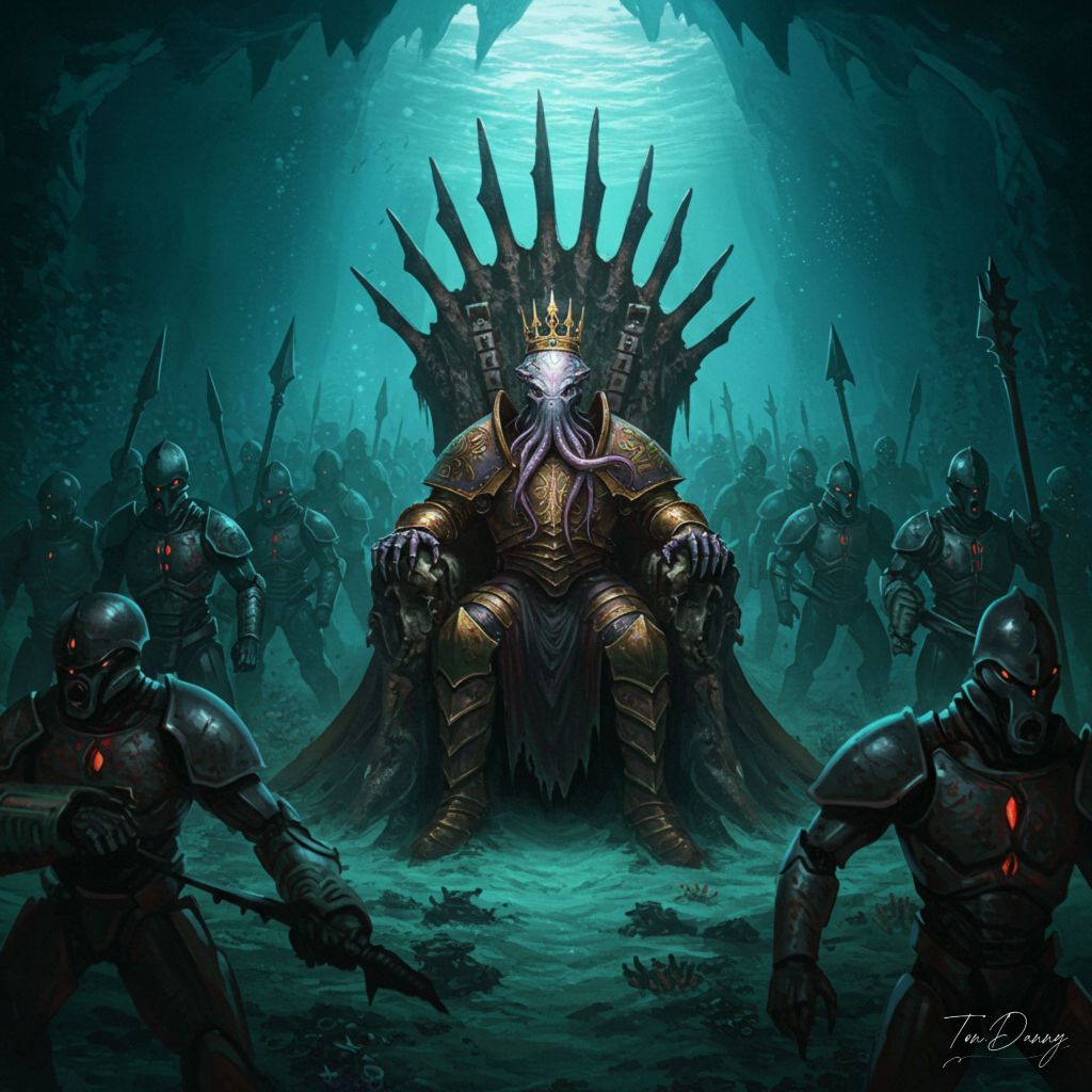 Beneath the ocean floor lies a rusted throne constructed from titanic spinal columns of extinct sea beasts. Upon it rests a tentacled alien warlord, clad in heavy abyssal armor glowing with a faded royal crest. Around him stands his army: hundreds of biomechanical soldiers, their designs a fusion of crustacean armor and powered exosuits, all remotely controlled through neural waves emitted from his throne. The king never moves—but his empire of steel marches endlessly across the trench.