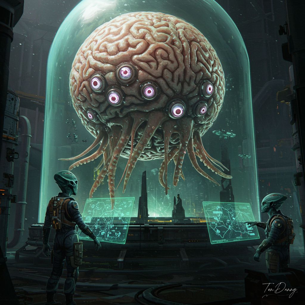 Floating in a sealed dome within the alien capital’s deepest district, Delphion is a gigantic spherical brain-mass, veiled in flowing sensory filaments like the fins of a lanternfish. Its countless bio-synthetic eyes blink asynchronously, projecting visions of past and future threats across the city’s tactical map. Alien operators, clad in squid-like operator suits, commune with Delphion through holographic neural chambers, directing the movement of the city’s defense fleet using its prophetic data.