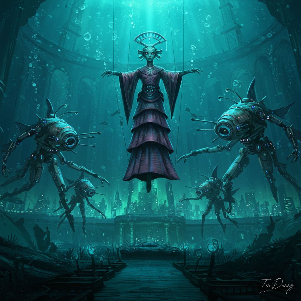 Beneath the glowing towers of a submerged alien city, a vast amphitheater flickers to life. At its center floats a puppetmaster-like alien, wrapped in layers of metallic robes woven with sonar-thread. Surrounding them are titanic machine puppets shaped like deep-sea beasts. With each wave of their antennae, the mechs move in unison—dancing, fighting, defending. The spectacle is both warfare and art: the battlefield is their stage, and the city their audience.