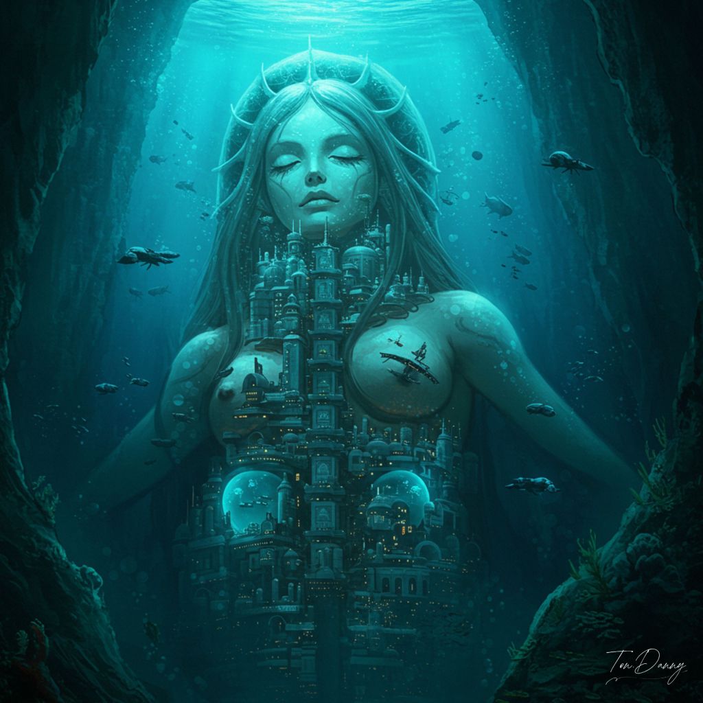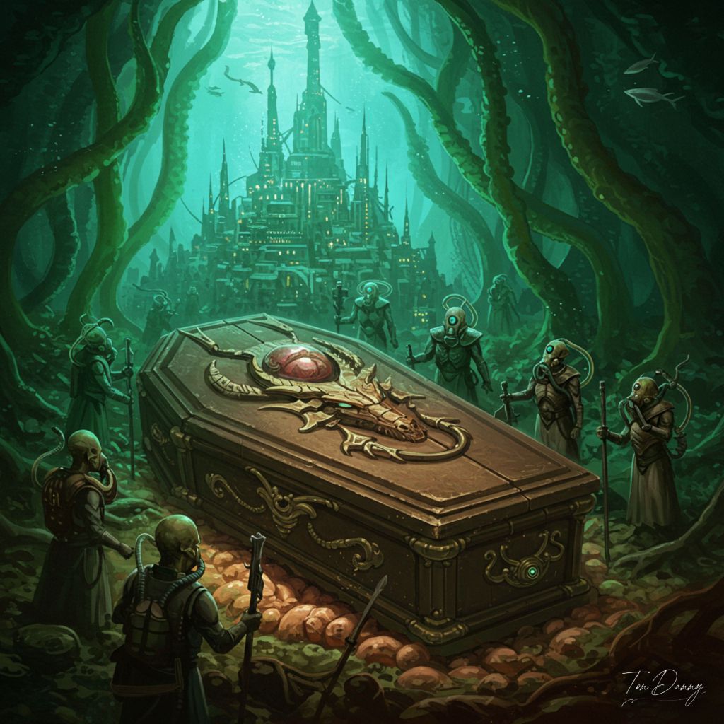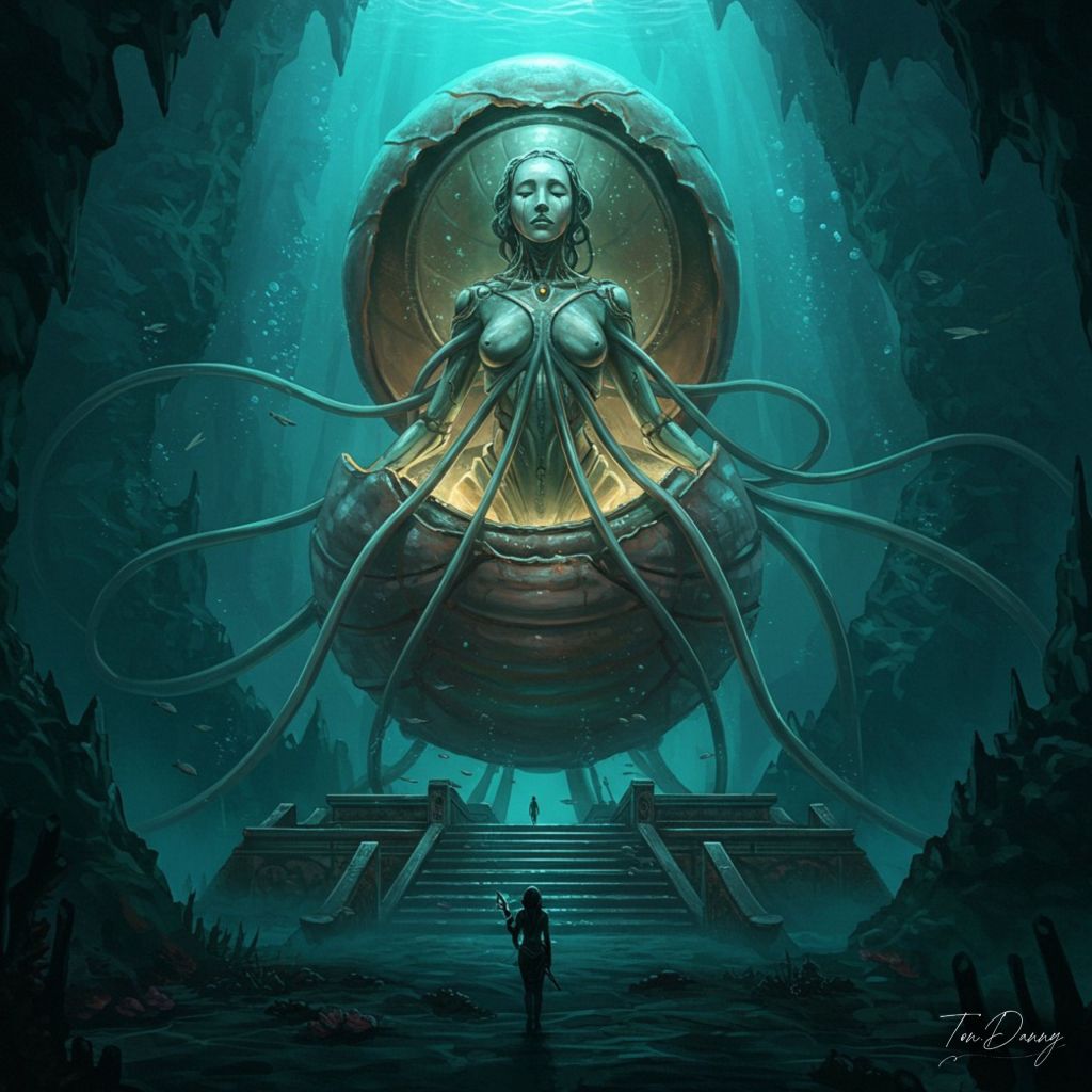 In a cavern beneath the oceanic underworld, a massive shrine houses a being known as the Silent Oracle—a humanoid figure fused within a mechanical chrysalis resembling a colossal rusted pearl. Only her head and arms are exposed, her features smoothed into a timeless mask of sorrow. Dozens of etherial filaments, both organic and cybernetic, extend from her womb-shell into the surrounding waters, seeding dreams and prophecies into any nearby consciousness. But every prophecy she grants comes at the cost of memory—those who listen forget everything but the Oracle’s final word: “Descend.”