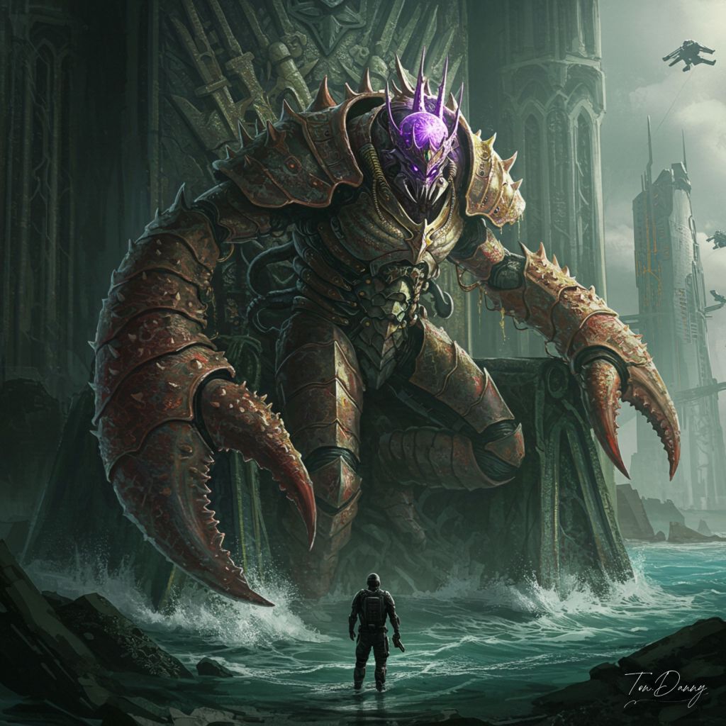 Rising from a throne of corroded alloy and barnacle-clad ruins, an ancient alien monarch awakens—its body encased in a colossal, crustacean-shaped exosuit, sculpted like a royal tomb and bristling with segmented armor, mechanical spines, and pulsating reactor ports. Its upper body twists forward, massive claws locking into position, limbs unfolding with a screech of pressurized joints and magnetic tendons. The once-motionless sovereign now leans toward the intruder, ready to strike, its every movement rumbling through the flooded vault. Its ornate crown, now glowing with blinding violet pulses, broadcasts psychic command-signals across the ocean—rerouting orbital shells, hijacking surveillance drones, and activating dormant war-constructs in distant towers. The sea obeys. The city holds its breath. This is no longer rule by stillness. This is war—declared by a machine-king reborn.