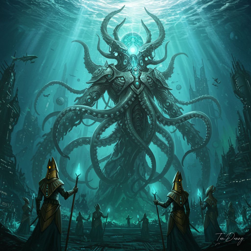From the depths of an alien ocean, a colossal machine sea deity awakens, its form resembling a fusion of a kraken and advanced alien technology. Its metallic tentacles are adorned with glowing alien runes, and its core is a pulsating energy reactor that looks like a bioluminescent alien heart. Alien priests clad in octopus-inspired armor chant to gain its favor, but the machine god turns against its creators, unleashing waves of destruction toward the futuristic city above.