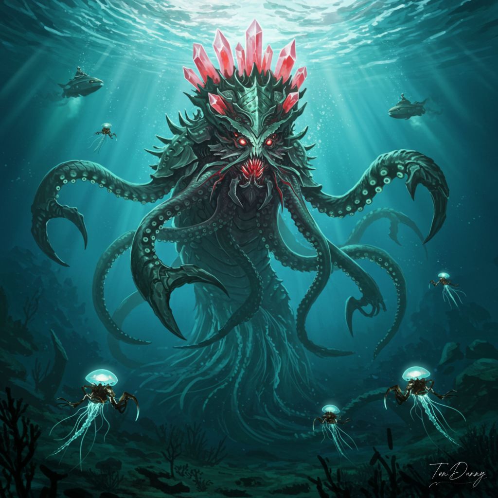 An alien-engineered sea beast with mechanical tentacles and a glowing exoskeleton rises from its slumber beneath the seabed. Its head is adorned with a crown of alien crystals that emit a pulsating red light, and its tentacles end in claws capable of tearing through submarines. Alien knights clad in armor resembling bioluminescent jellyfish ride smaller mechs to confront the beast, but its adaptive AI makes it an almost indomitable foe.