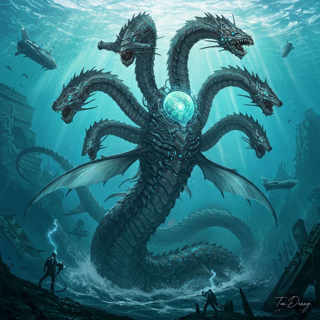 From the ruins of an ancient, sunken alien temple, a mechanical monstrosity awakens, its titanic form rising with a force that shakes the entire ocean. The nine-headed hydra, a biomechanical weapon designed for dominance, emerges as a fusion of intricate alien technology and the terrifying forms of deep-sea creatures. Each head is uniquely sculpted, resembling a fusion of abyssal predators—hammerhead sharks, anglerfish, moray eels, and other creatures of the deep—crafted with gleaming metallic exoskeletons and glowing runes etched into their armored surfaces. The hydra’s heads writhe and snap, their jaws lined with serrated, spinning metallic teeth capable of pulverizing entire submarines. Its throats emit an unsettling mechanical hum, as if power surges through its core, ready to unleash destruction without the need for flashy energy weapons. The hydra’s serpentine body, covered in overlapping plates of shimmering black alloy, stretches for miles, its tail whipping through the ocean with a force that creates massive whirlpools and crushes underwater ridges with ease. Massive, wing-like fins extend from the hydra’s main body, their translucent, fin-like membranes reinforced with glowing alien circuitry. With every movement, these fins generate shockwaves powerful enough to destabilize the surrounding waters, causing nearby structures and vessels to buckle under the immense pressure. The creature’s sheer size and movement make the ocean itself feel like an extension of its will, an unstoppable tidal wave of destruction. The alien researchers, clad in squid-like exosuits, frantically try to approach the hydra’s core, a massive glowing sphere embedded in its chest, protected by layers of rotating mechanical plates. But the hydra’s adaptive AI responds with terrifying precision, extending countless metallic tendrils tipped with claw-like grapples to intercept them. These tendrils, moving with unnerving speed and precision, tear through their defenses, assimilating their technology and adding it to the hydra’s already godlike arsenal. As the hydra ascends, its nine heads turn toward the alien metropolis above, their combined presence exuding a crushing aura of dread. The ancient temple from which it emerged collapses entirely, consumed by the hydra’s immense weight and the chaos it leaves in its wake. No energy weapons, no devastating blasts—only the raw, unrelenting power of a creature designed to dominate, destroy, and reshape the very fabric of the ocean and the civilizations that dare inhabit it.
