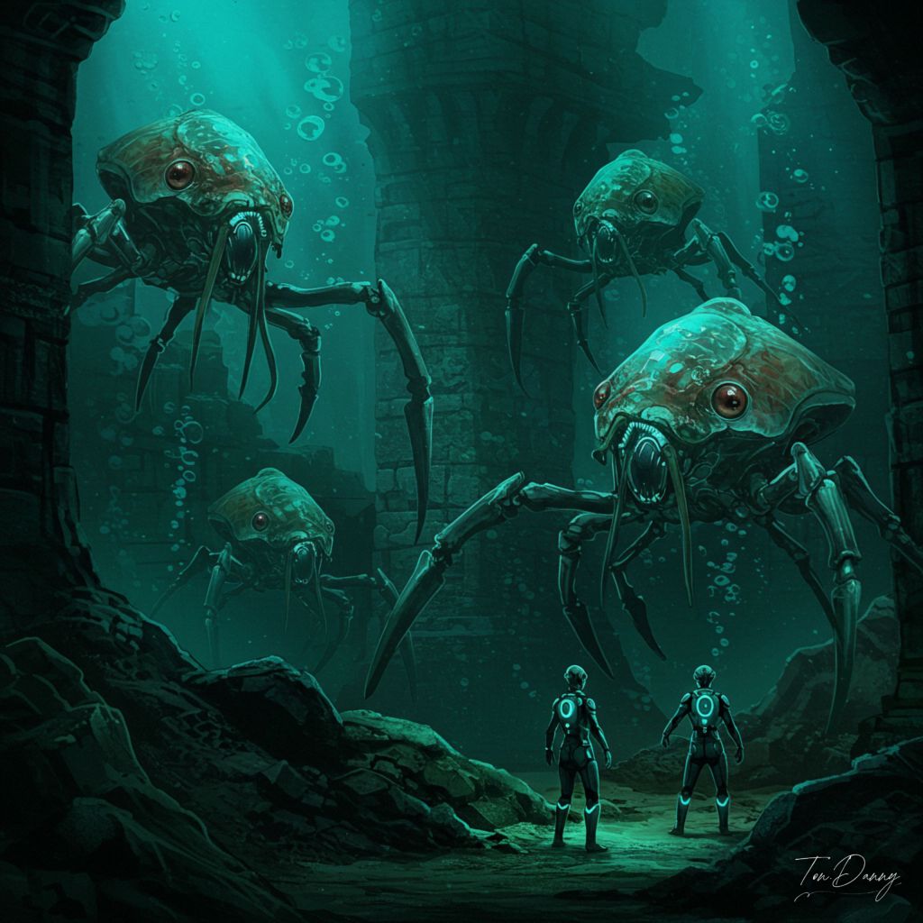 In the ruins of an ancient alien prison, bio-mechanical guardians awaken to protect the secrets buried within. Each guardian is a hybrid of alien sea creatures and machine parts, with glowing eyes and segmented, crab-like limbs. A team of alien explorers in luminous exo-suits, each designed to resemble sea life, must navigate the labyrinth while evading the relentless mechanical sentinels.