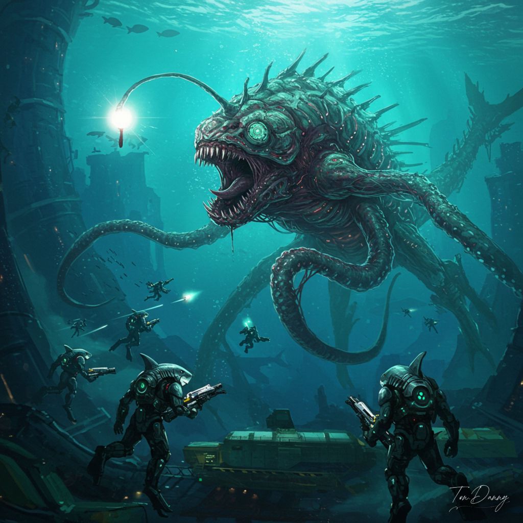 An alien-designed weapon in the form of a massive, bio-mechanical sea monster invades an underwater colony. Its body is a grotesque blend of metallic tentacles and glowing organic tissue, with a head shaped like a giant anglerfish, its lure emitting pulses of hypnotic light. Alien defenders in shark-like mech suits attempt to repel the invader, but the creature’s AI anticipates every move, adapting its attacks with precision.