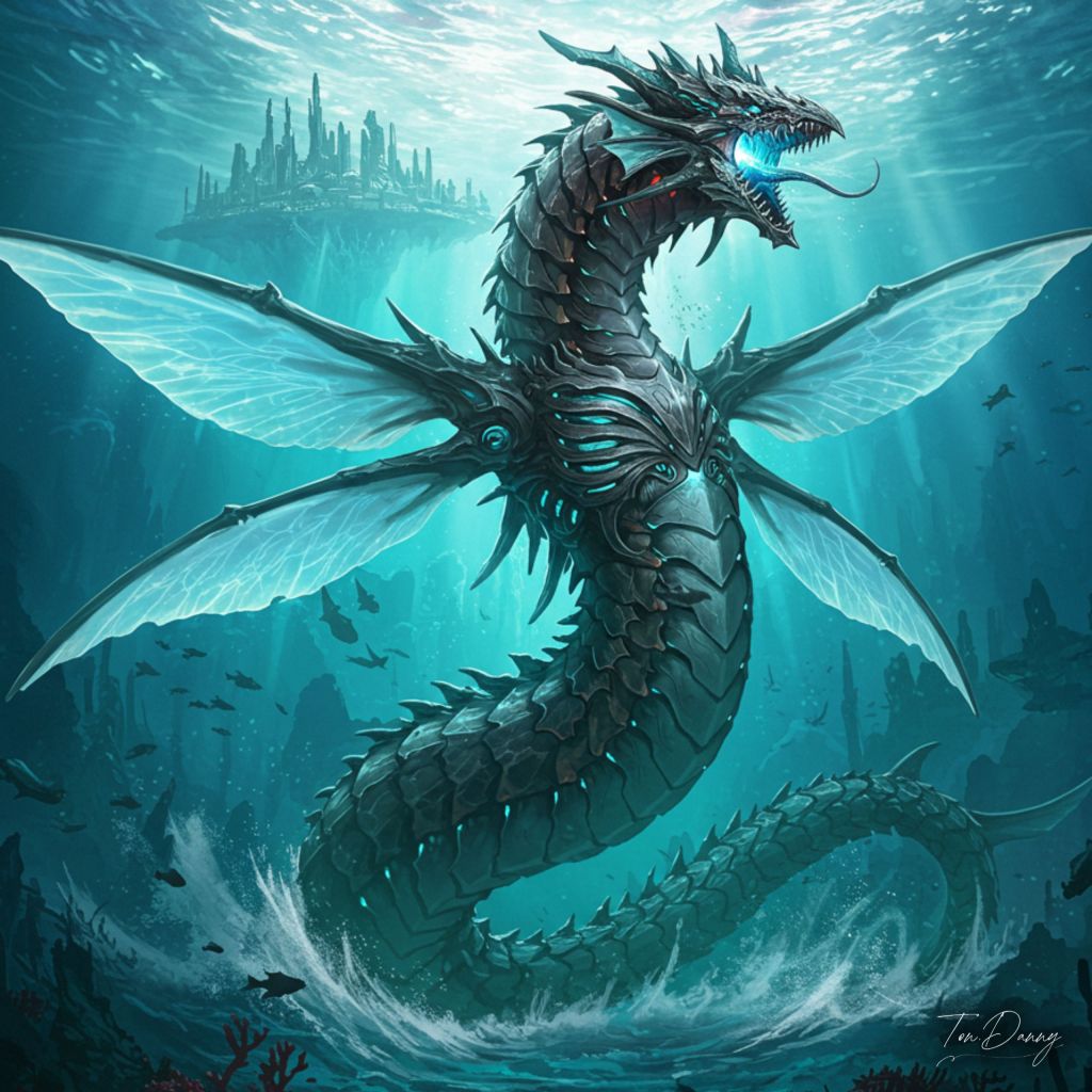 From the deepest chasm of an alien ocean, an unimaginable terror awakens. A titanic bio-mechanical dragon, its body stretching beyond the horizon, rises with earth-shaking force. Its serpentine form is clad in interlocking metallic scales, each the size of a skyscraper, glowing with shifting patterns of alien energy that ripple like veins across its monstrous body. Massive, translucent fins resembling the wings of abyssal fish extend from its back, their edges lined with razor-sharp metallic spines that shimmer with deadly light. These fins emit bursts of plasma energy with every movement, creating tidal waves that devastate the ocean floor and everything above it. The leviathan’s head is crowned with jagged, coral-like horns that arc back into glowing antennae, pulsating with electromagnetic energy strong enough to disable entire fleets. Its glowing, serpentine eyes burn with an intelligence that feels ancient and unrelenting, and its jaws—lined with rotating rows of metallic teeth—can swallow entire cities. A gaping, spinning maw resembling the beak of a colossal octopus is embedded in its chest, releasing gravitational pulses so powerful they pull ships and submarines into its clutches, crushing them with unimaginable force. As it ascends, the leviathan’s colossal form splits the ocean itself, creating walls of water on either side as its glowing fins generate hurricanes of energy. Its immense tail, covered in blade-like fins and tipped with a spiked turbine, moves with terrifying speed, severing entire mountains of coral and annihilating anything in its path. The creature’s roar is a deafening, multi-layered sound—a fusion of grinding metal and guttural growls—that causes tremors across the ocean floor and even shakes the alien metropolis above, threatening to collapse it into the abyss. Alien submarines designed like sharks and manta rays swarm the leviathan, firing volleys of plasma torpedoes and energy lances. Yet their attacks barely scratch the creature’s armored hide. The leviathan retaliates by unfurling its fins, releasing shockwaves of energy that vaporize its attackers in an instant. The ocean itself seems to bend to its will, as if the leviathan commands not just the water, but the very laws of nature. As it rises toward the surface, the leviathan’s immense silhouette blots out the faint sunlight, its glowing scales and wings illuminating the dark waters like a god of destruction. The alien civilization above watches in terror as their once-advanced city trembles under the shadow of the mechanical sea dragon, knowing that no weapon or strategy can stop the inevitable annihilation.