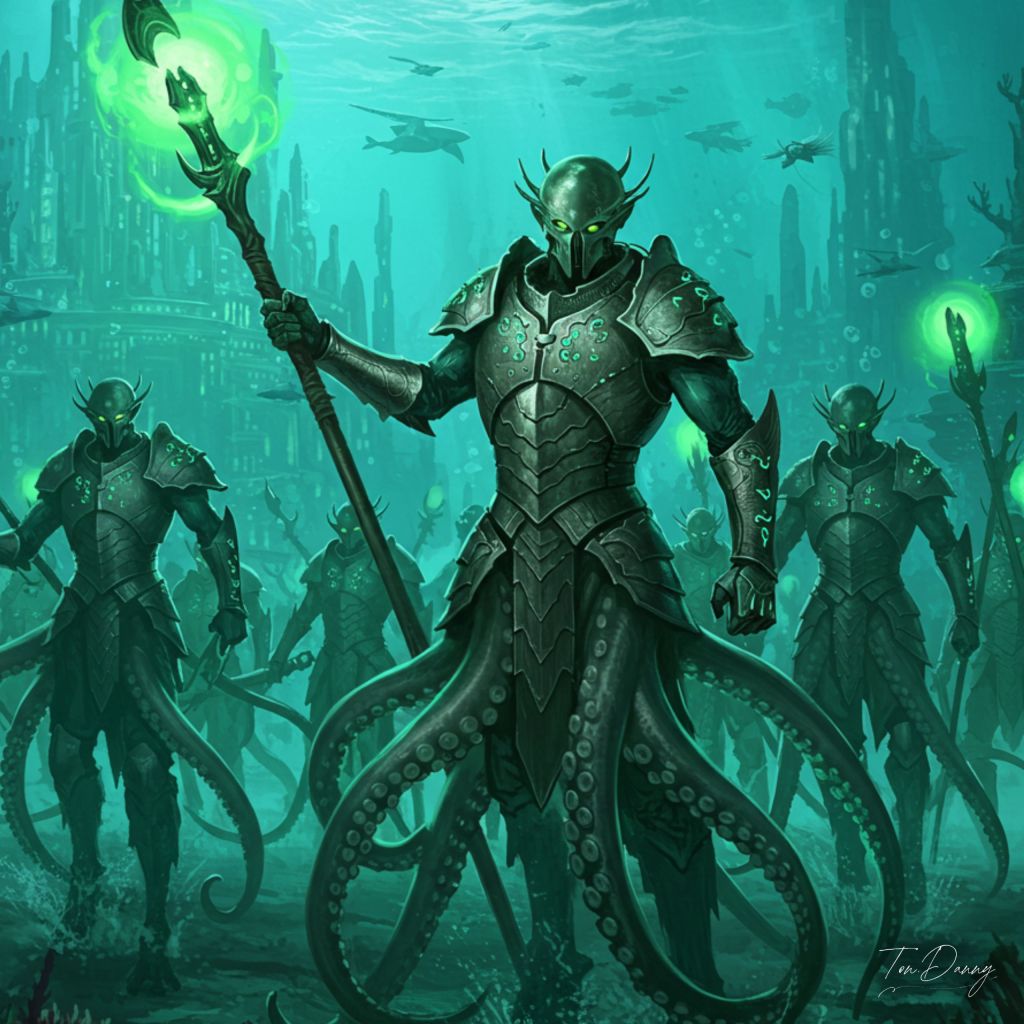 An order of alien knights, their lower halves replaced with mechanical octopus tentacles, emerges from the depths. Their shell-like armor glows with alien runes, and their weapons pulse with an ominous green energy. The knights march toward the oceanic city above, their collective telepathic chant echoing through the waters, spreading fear among the alien populace.