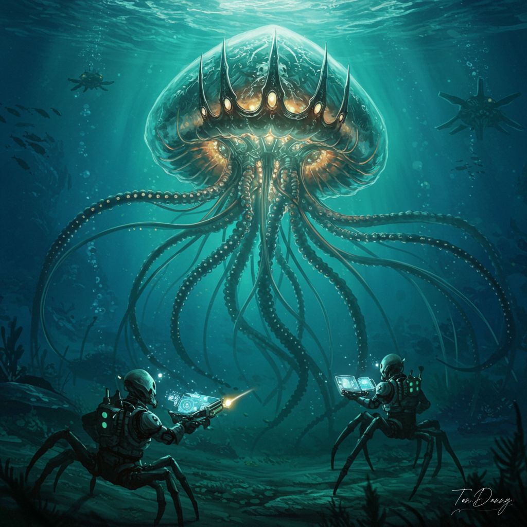 A bio-mechanical weapon resembling a massive jellyfish with a crown-like structure at its core roams the alien ocean. Its tendrils are lined with energy siphons that drain the life force of anything they touch. Alien engineers in crab-like suits attempt to deactivate it, but the weapon’s AI turns the engineers’ own technology against them.