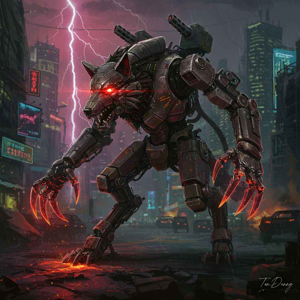 Oil Painting Beast-shaped Robot Cyberpunk Style The towering cybernetic wolf, its titanium-reinforced frame rippling with segmented plating and exposed energy conduits, stalks the remains of a fallen Cyberpunk metropolis. Its glowing crimson optics, shielded by an adaptive armored visor, scan the war-torn cityscape, hunting for survivors in the neon haze. Each massive hydraulic claw, lined with oscillating plasma talons, leaves behind molten trails in the fractured asphalt as it moves. A Cyberpunk Style Plasma Rail Howitzer, mounted along its armored spinal column, charges with an ominous hum, ready to discharge hyper-compressed energy rounds capable of leveling city blocks. The sky above crackles with neon lightning, while failing holographic billboards flicker between malfunctioning corporate warnings and emergency evacuation orders. As the cybernetic juggernaut lets out a piercing howl, its vented exhaust systems release bursts of pressurized plasma vapor, igniting the rain into showers of digital embers.